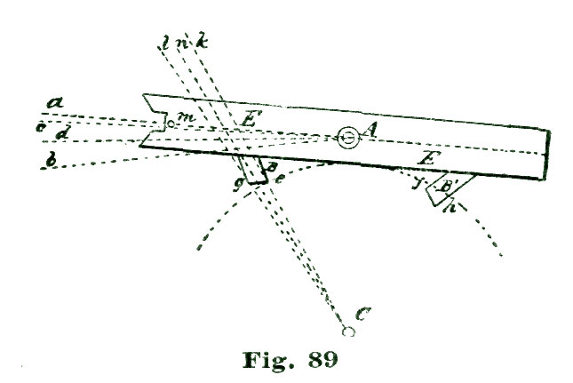 Now, when we adopt circular pallets and carry the locking face of the entrance pallet around to the left two and a half degrees, the true center for the pallet staff, if we employ tangent lockings, would be located on a line drawn tangent to the circle a a from its intersection with the radial line A k, Fig. 21. Such a tangent is depicted at the line s l'. If we reason on the situation, we will see that the line A k is not at right angles to the line s l; and, consequently, the locking face of the entrance pallet E has not really the twelve-degree lock we are taught to believe it has.