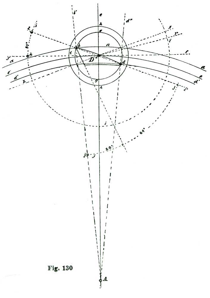 From the point e, which represents the center of the pallet staff, we draw through b the line e f. At one degree below e f we draw the line e g, and seven and one-half degrees below the line e g we draw the line e h. For delineating the lines e g, etc., correctly, we employ a degree-arc; that is, on the large drawing we are making we first draw the line e b f, Fig. 10, and then, with our dividers set at five inches, sweep the short arc i, and on this lay off first one degree from the intersection of f e with the arc i, and through this point draw the line e g.