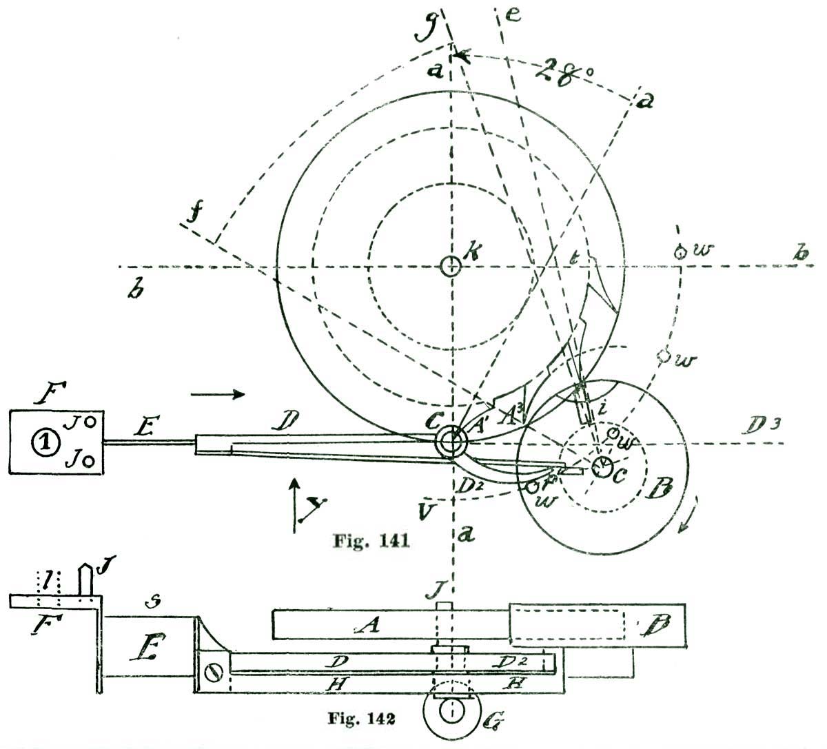 We next set the dividers so they embrace the space on the radial line A b between its intersection with the line B j and the center A, and from A as a center sweep the arc i, said arc defining the addendum of the escape-wheel teeth. We draw a line from the intersection of the radial line A f with the arc i to the intersection of the radial line A g with the arc a, and thus define the impulse face of the escape-wheel tooth D. For defining the locking face of the tooth we draw a line at an angle of twenty-four degrees to the line A g, as previously described. The back of the tooth is defined with a curve swept from some point on the addendum circle i, such as our judgment will dictate.