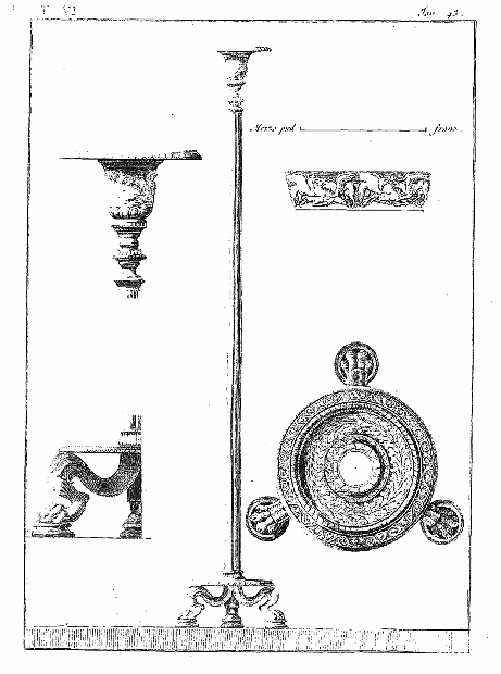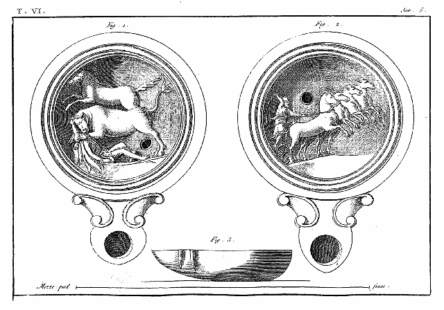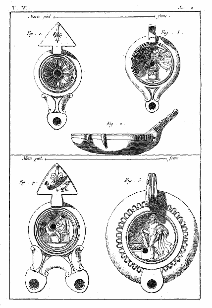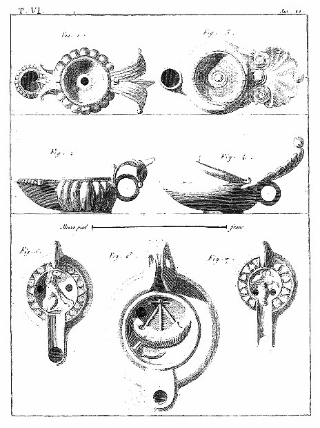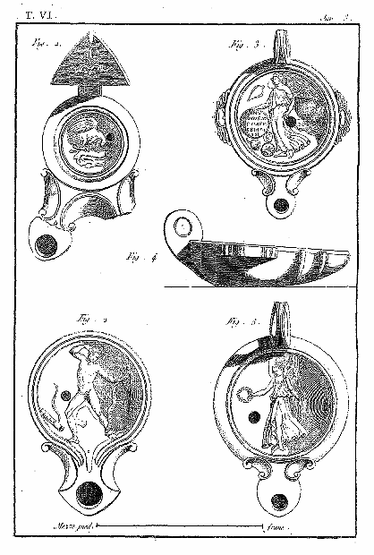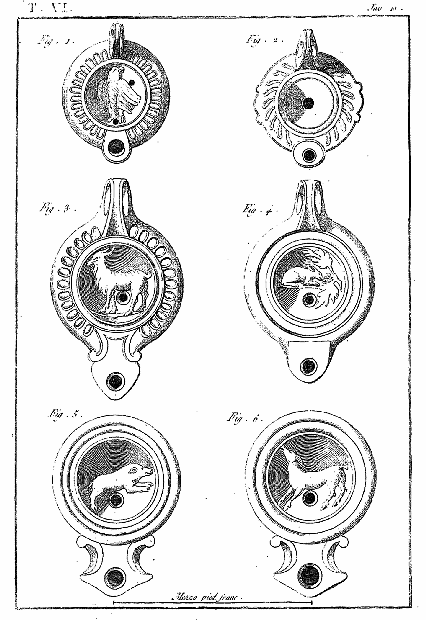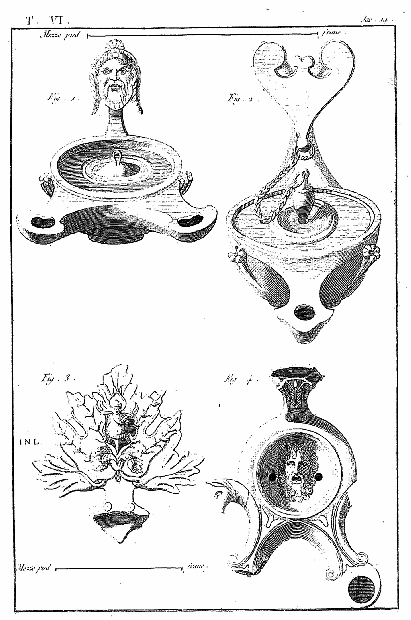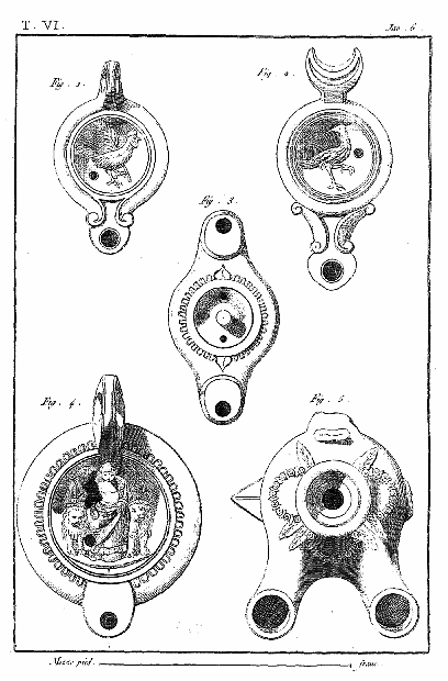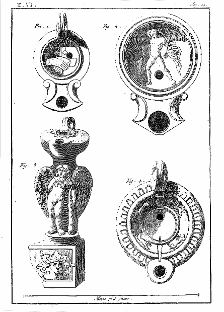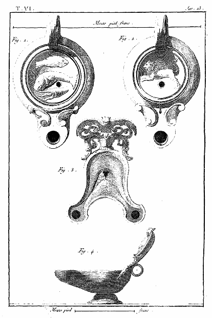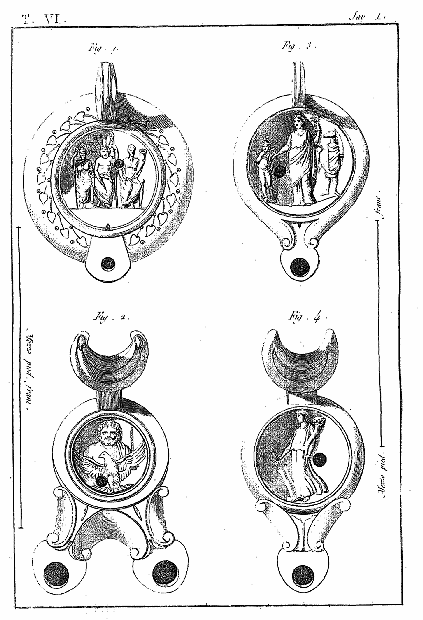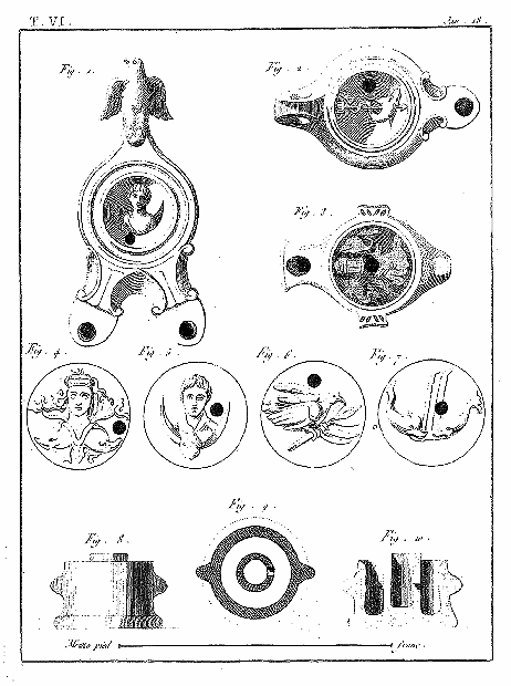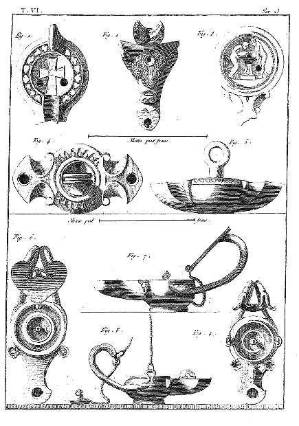 Ce 6e volume, contenant les Lampes et les Candélabres, fait, dans notre division, la troisième partie des Antiquités d'Herculanum, et, dans des monumens plus simples, offre un degré d'intérêt qui le rend encore précieux après l'exposition des Peintures et des Bronzes. Les Lampes (lucernæ ou lychni), consacrées par les besoins usuels et par la piété, se sont tellement multipliées, qu'il en est parvenu un grand nombre jusqu'à nous; les Antiquaires les ont divisées en plusieurs classes, sous les dénominations de lampes sacrées, lampes domestiques et lampes sépulcrales. Montfaucon observe judicieusement que, malgré ces distinctions, il serait très-difficile d'assigner à chacun de ces monumens sa classe particulière. En effet, celles que nous publions ont presque toutes été trouvées dans les maisons, et ne diffèrent pas des lampes sépulcrales publiées par Bellori ou par d'autres; il ne paraît même pas que celles qu'on allumait dans les temples, et qui devraient être proprement dites sacrées, soient absolument distinctes des autres; et il est vraisemblable qu'on se servait indifféremment de toutes dans les cérémonies religieuses et dans l'usage privé. La variété des formes et des emblêmes dépendait du caprice des artistes ou de la fantaisie de celui qui faisait fabriquer ces objets. On trouve dans les inscriptions, à la Fortune domestique, à Jupiter domestique, Minerve domestique, etc.; c'est alors le signe d'une dévotion particulière, et on peut en dire autant de toutes les lampes qui portent la figure de quelque divinité; ce sont ces sortes de lampes que nous nommerons sacrées. Beaucoup d'autres sont relatives à la profession ou aux goûts de leurs possesseurs. Celles qui portent des figures de gladiateurs peuvent être considérées comme lampes sépulcrales; elles peuvent aussi se classer parmi celles destinées à éclairer les salles d'exercices des gladiateurs, et même les échoppes ou les boutiques des amphithéâtres, des théâtres et des cirques. Nous aurons soin, au reste, de ne point omettre, dans le cours de nos explications, les particularités plus ou moins curieuses qui peuvent jeter quelque jour sur les usages des anciens: si cette matière a été épuisée par une foule de savans auteurs, dont nous nous plaisons à répéter les opinions plutôt qu'à donner les nôtres, nous prions nos lecteurs de considérer que nous n'avons pour but que d'aider leur mémoire, en examinant avec eux les monumens dont nous leur offrons une copie fidelle.