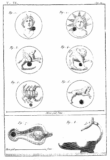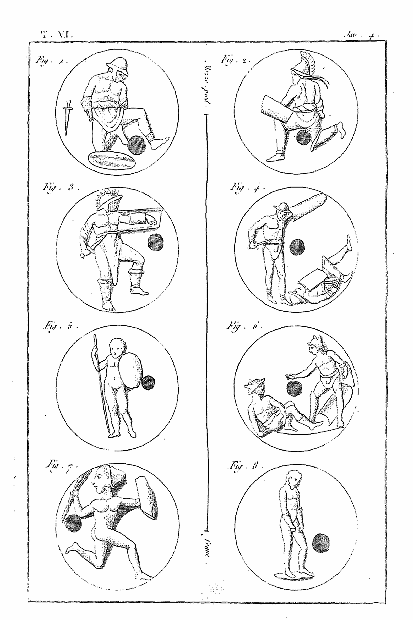 Nous nous contentons de rapporter dans cette planche les médaillons de plusieurs lampes, dont la forme est peu curieuse; on y voit des gladiateurs en différentes attitudes. L'opinion que les mânes ou les dieux infernaux s'appaisaient par le sang humain, paraît avoir été l'origine des combats de gladiateurs, si l'on en juge par la coutume barbare d'immoler des prisonniers de guerre ou des esclaves dans les funérailles des princes et des grands. L'invention de ces combats est le plus communément attribuée aux étrusques, dont les monumens funèbres offrent souvent de telles représentations. Quoi qu'il en soit, le goût en fut porté jusqu'à la fureur chez les Romains, qui les admettaient comme un divertissement au milieu des festins. Non contens d'en jouir comme d'un spectacle, des hommes libres, des chevaliers, des sénateurs se plaisaient à s'y livrer. Les femmes même partagèrent cette fureur, et l'empereur Sévère fut obligé de rendre un édit pour leur interdire ces jeux sanglans. C'était le spectacle qui excitait le plus la curiosité du peuple. Les empereurs le faisaient principalement donner à l'ouverture des guerres, sans doute pour exciter le courage dans l'âme des soldats. Les occasions en étaient, au reste, très-fréquentes. Les magistrats, et sur-tout les édiles, faisaient donner des combats de gladiateurs, en prenant possession de leurs charges; mais ce spectacle paraît avoir été particulièrement consacré aux pompes funèbres, dans celles même de simples particuliers, qui le prescrivaient fréquemment par leurs testamens, et faisaient des legs ou des fondations pour qu'il fût renouvelé à chaque anniversaire. On peut donc considérer comme lampes sépulcrales, plusieurs de celles qui portent des images de gladiateurs. Ces figures ne sont point toujours un monument des combats exécutés en l'honneur des morts: l'image des cérémonies, qu'on n'avait pu exécuter, suffisait dans l'opinion religieuse pour appaiser les mânes.