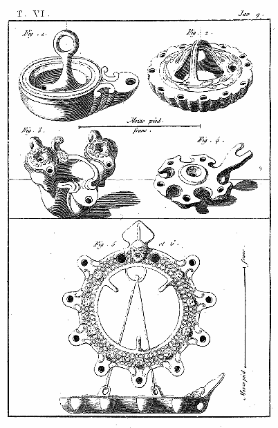 FIG. III et IV. Cette lampe curieuse est un monument de l'antique usage des étrennes, qui remonte jusqu'au roi Titus-Tatius, ou du-moins jusqu' Numa. On se faisait des souhaits réciproques; on s'envoyait des présens (strenœ) différens de ceux dits Xenia, dons mutuels de l'hospitalité. Ces marques de bienveillance avaient lieu, comme encore de nos jours, le premier janvier; le second jour était nefaste; le troisième était en quelque sorte le plus solennel; c'était celui où l'on offrait des sacrifices, où l'on faisait des vœux publics pour la prospérité des empereurs. Ces fêtes étaient prolongées pendant presque tout le mois, et étaient désignées par kalendes de janvier. Dans des temps plus rapprochés, les chrétiens, qui avaient conservé l'usage des étrennes, y ajoutaient des divertissemens consistant en festins et en déguisemens sous l'habit de femme, et sous le masque de différens animaux, ce qu'on appelait vetulam et cervudum facere. C'est de-là qu'on fait dériver l'origine du carnaval, dont les folies, commençant au mois de janvier, se rattachent à d'autres extravagances empruntées aux anciens. La figure principale de la lampe est une Victoire aîlée, tenant une palme et un bouclier, sur lequel on lit l'inscription ANNUM NOVUM FAUSTUM FELICEM MIHI, que le nouvel an soit heureux pour moi! formule usitée, et celle dont on se saluait réciproquement dans ce jour de fête. Ce salut était au nombre des présages, heureux qu'on recueillait par l'ouie, omina; ceux qui frappaient la vue étaient appelés monstra. Par le mot MIHI, on voit que notre lampe était une étrenne que la personne se donnait à elle-même. Il est bon encore d'observer que, dans les souhaits et dans les prières pour la félicité, chacun avait coutume de se nommer le premier. Sur le fond du médaillon sont semés différens objets qu'on s'offrait en dons réciproques aux étrennes. La large feuille paraît représenter un éventail (flabellum); plus bas est une datte (caryota) renfermée dans sa gousse; une médaille où est représenté le signe de la bonne-foi ou de la concorde, deux mains unies et deux serpens formant caducée; une autre médaille, Victoire aîlée; de l'autre côté de la figure, une troisième médaille avec la double face de Janus, divinité qui présidait à la nouvelle année et au premier mois appelé Januarius (Janvier) de son nom; un objet qu'on ne peut discerner; enfin, une espèce de paquet qui paraît représenter une masse de figues sèches (caricœ). Ces figues se transportaient dans des vases de terre, dont l'objet en question paraît avoir la forme, suivant l'expression de Martial, torta meta (XIII, 28). On apprend effectivement par des passages recueillis dans les poètes, que les étrennes d'usage étaient des figues sèches, des dattes, des noix (et sous le nom de noix, il faut entendre plusieurs sortes de fruits), enfin des monnaies. Les dons d'argent n'avaient pas seulement lieu entre les particuliers; on en faisait aux empereurs et aux princes, dont on recevait de semblables dons de la main à la main. Dans la suite, le sénat fit offrir les monnaies l'empereur dans une patère d'or, par le préfet de la cité. Honorius fixa ces présens à une livre d'or, et l'empereur faisait distribuer aux magistrats et aux personnes de distinction, d'autres monnaies ou médailles, le plus souvent frappées à son image. On trouvera des lampes semblables à la nôtre, rapportées par Bellori (Luc. sep. P. III, Tab. V) et Passeri (Luc. fic. P. I, Tab. VI).