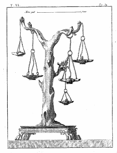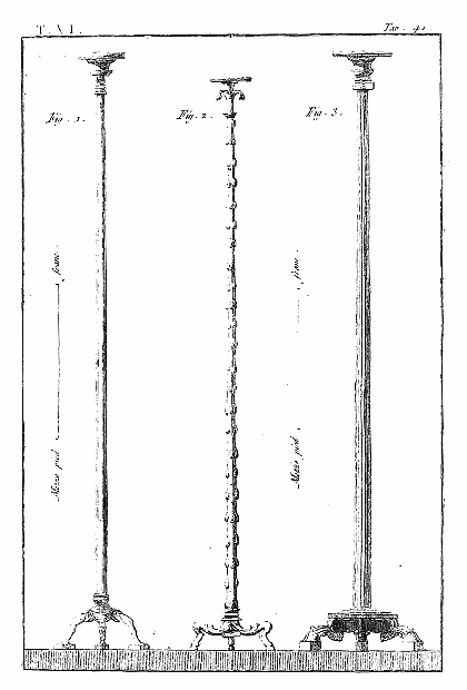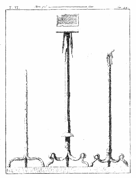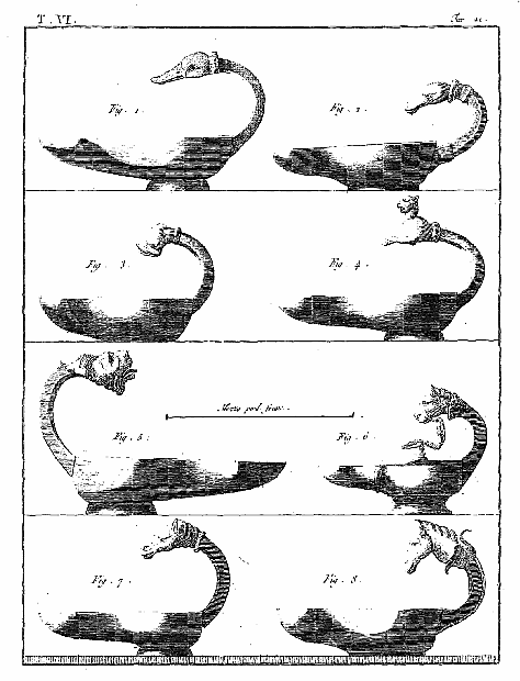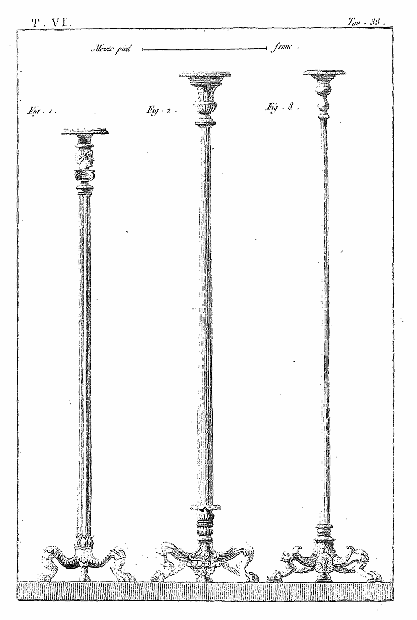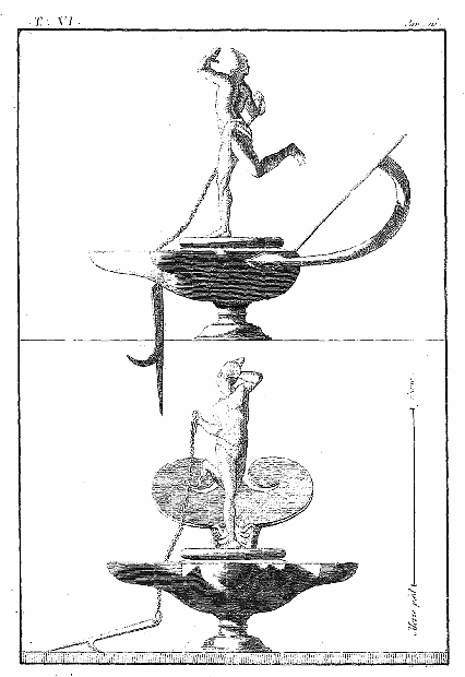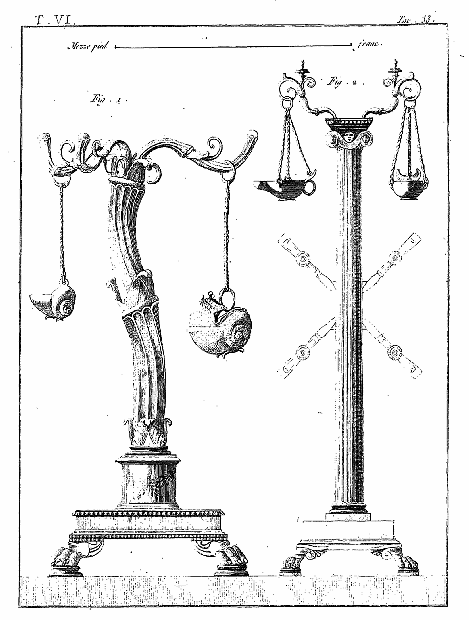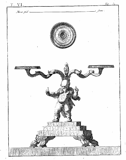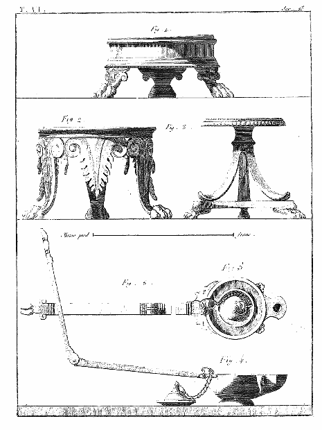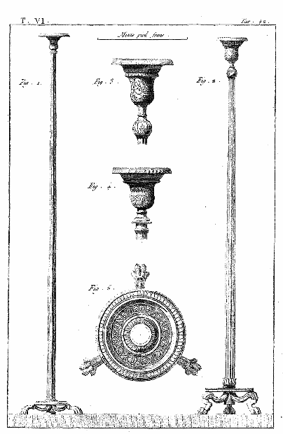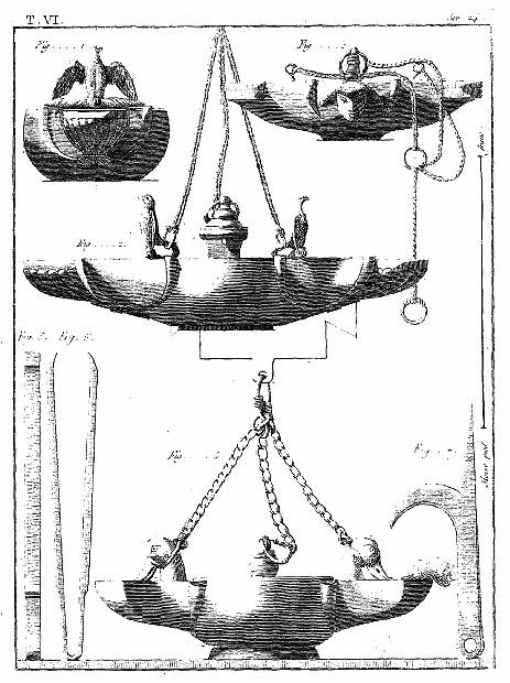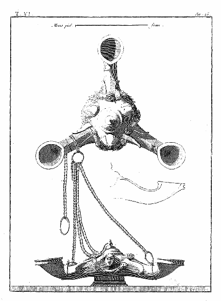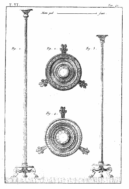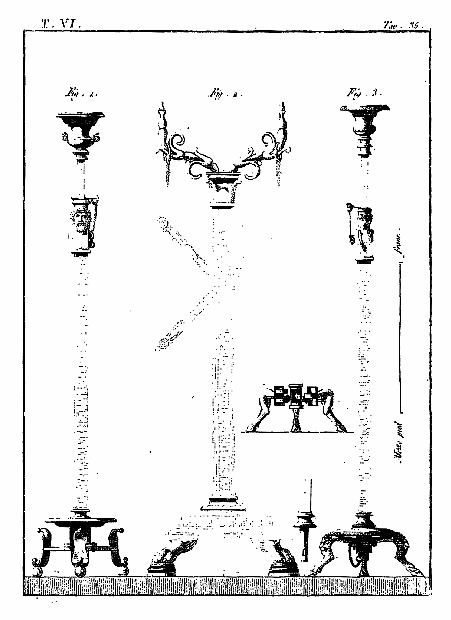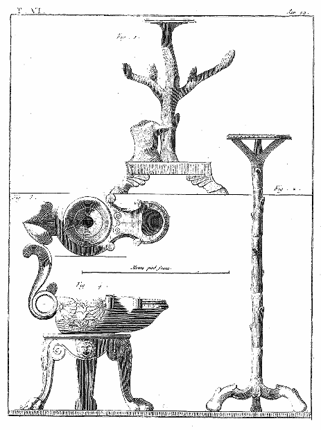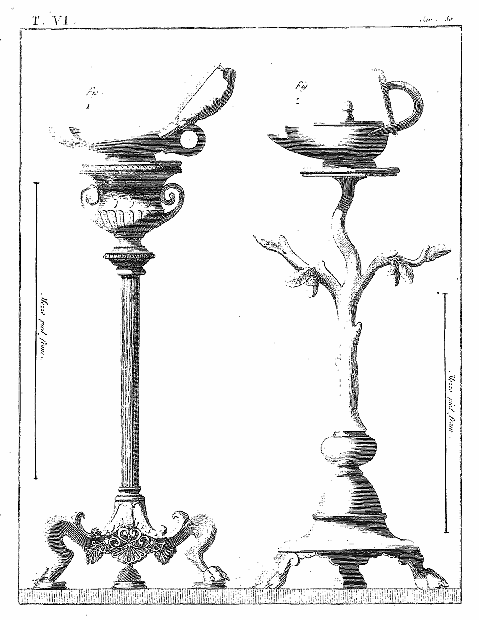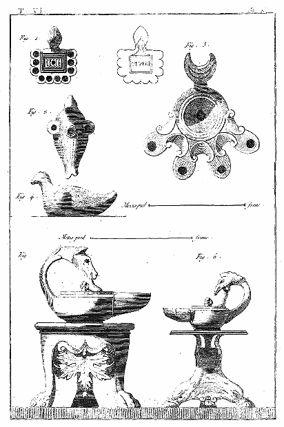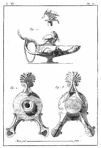 Les lampes étaient ordinairement de bronze ou de terre cuite, et l'on aura souvent occasion d'admirer, dans les lampes de cette dernière espèce, combien était répandu le sentiment du beau, et de se confirmer dans cette observation: que si des hommes ingénieux font la gloire de leur siècle, la gloire de ce même siècle conserve long-temps, parmi leurs successeurs, l'esprit dont les premiers furent animés, et fait revivre cet esprit après les nuits de la barbarie. On ne saurait donc trop applaudir aux efforts des artistes qui tendent, en profitant des exemples de l'antiquité, à répandre ce goût conservateur dans tout ce qui appartient aux besoins les plus familiers. Pour nous, nous croirons avoir peu fait pour les arts, si l'imitation par la gravure des objets précieux que la découverte d'Herculanum a rendus à la lumière, ne faisait naître, dans les productions du goût, des imitations plus solides et plus heureuses.