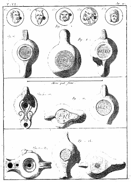 Les lampes représentées dans cette planche sont de terre cuite. Pour ne point nous répéter à chaque explication, nous prévenons nos lecteurs que nous ne ferons à l'avenir mention de la matière que lorsqu'elle changera de nature.
