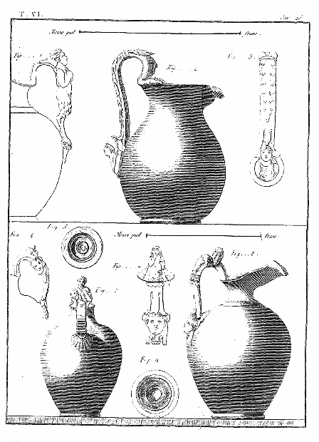 FIG. VI. Le vainqueur paraît tendre la main au vaincu pour le secourir: cet acte d'humanité, que nous n'avons point encore vu exprimé dans d'autres monumens, rend notre lampe précieuse. C'était au peuple que le vaincu demandait la vie, en élevant le doigt en l'air. Nous voyons sans doute ici ces gladiateurs représentés au moment qui suit cette action. De cette coutume venait l'expression ad digitum pugnare, quand les deux champions convenaient de ne point se faire de quartier jusqu' ce signe.