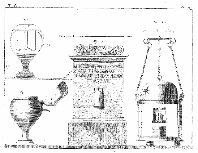 FIG. V. Lampe à une seule mèche; Hercule avec un autel. L'objet qui est posé sur cet autel a été expliqué par M. Visconti. C'est la grande coupe d'Hercule (scyphus Herculaneus) que ce héros avait reçue en présent du Soleil, et qui, selon la fable, avait, en certaine occasion, servi de bateau au fils d'Alcmène.