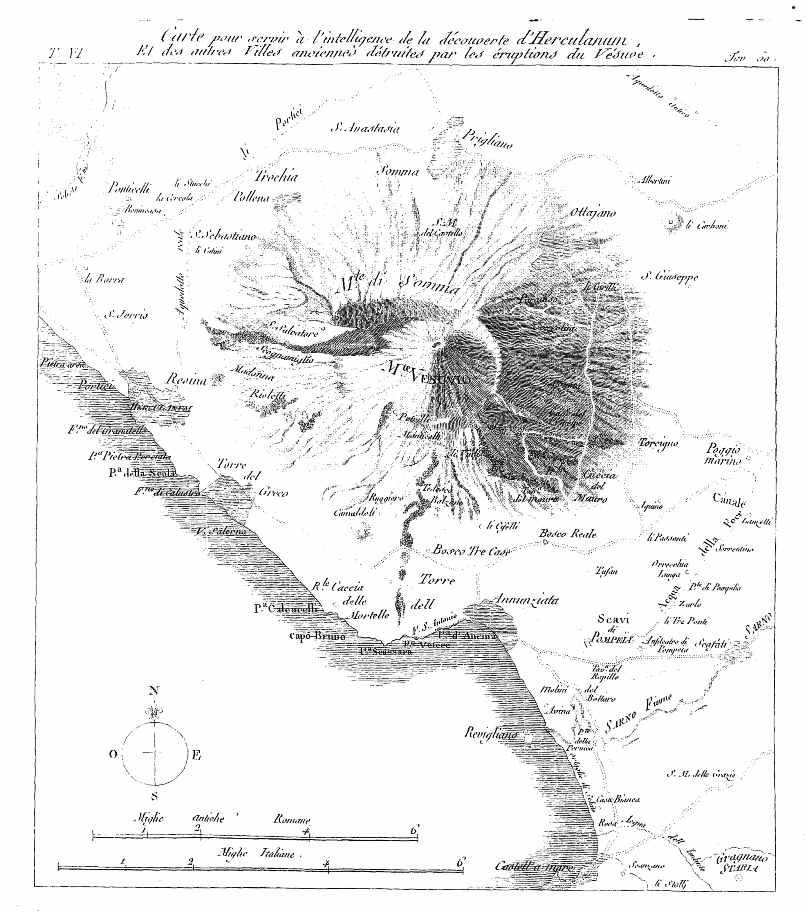 Indépendamment de ces villes principales, tout le rivage était couvert d'habitations agréables qu'on bâtissait quelquefois jusque dans la mer, pour y trouver la fraîcheur que produit le mouvement des flots. La fertilité qui jaillissait des causes même de destruction, a, de tout temps, répandu sur ces lieux dangereux, un charme dont les événemens les plus désastreux n'ont pu détruire le prestige. Nous voyons encore de nos jours des jardins délicieux creusés dans la lave; à peine ces fleuves de marbre et de métaux fondus sont-ils refroidis, qu'on vient chercher sur leurs bords l'habitation qu'ils ont épargnée; on creuse leurs flancs pour découvrir le sol; on taille, on enlève leurs riches débris, pour construire des édifices, pour consolider des routes qui doivent être de nouveau abîmées par les torrens destructeurs, Le pavé des villes antiques mêmes était formé de laves. La première éruption dont l'histoire ait conservé le souvenir, est celle qui eut lieu la première année du règne de Titus, l'an 79 de l'ère chrétienne, celle à laquelle on a attribué la destruction totale des villes déterrées dans le siècle dernier. Avant l'époque dont nous venons de parler, les témoins nombreux qui annonçaient le voisinage d'un ennemi aussi redoutable que l'Ætna, semblaient être muets pour les habitans de ces contrées. Si la tradition des anciennes fureurs de quelques volcans avait été conservée par les poètes, elle était comme reléguée dans le domaine des fictions. La fable des Géans phlégréens, la description que Virgile fait des enfers, description qui nous guide encore aujourd'hui pas à pas sur les mêmes lieux, en renferment les traces les plus sensibles: mais il n'est question que des campagnes de Cumes; et l'on est surpris de voir l'auteur des Géorgiques parler de la fertilité du Vésuve, sans remonter à la cause dangereuse qui la produit, et qu'il semble tout-à-fait ignorer. Pline l'ancien, qui porta si loin ses recherches sur l'histoire naturelle, à qui l'incendie du Vésuve fut si funeste, parle deux fois de cette montagne célèbre par ses vins, sans paraître instruit de la nature sulphureuse du sol. Cette remarque n'avait point échappé à l'exact Strabon, qui parle d'ailleurs (liv. V) du sommet du Vésuve, comme d'un volcan éteint. Diodore de Sicile (l. IV), parle aussi des traces d'embrâsemens qu'offre la montagne, mais sans entrer dans aucun détail.