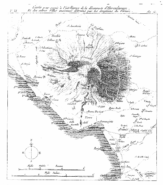 Les couches de l'attérissement montrent différentes époques auxquelles il a eu lieu. Herculanum ne fut point inondé tout-à-coup par des torrens de feu et de lave liquéfiée. Cette ville fut encombrée par une pluie de cendres brûlantes, dont la chaleur fut si grande, qu'elle réduisit en charbon les poutres des maisons et les objets combustibles; cette émission de cendres fut suivie, et peut-être immédiatement, de lavasses qui en firent une croute solide. On a même imaginé que l'eau de la mer, à la faveur des secousses de la terre, avait pénétré dans le gouffre qui l'avait ensuite vomie par torrens. On cite deux éruptions modernes où ce phénomène est raconté comme certain. En 1631 et 1698, l'absorption fut telle que le bassin du port se montra à sec un moment, et que les eaux et la lave, lancées par le Vésuve, se trouvèrent mêlées d'une quantité de coquillages de toute espèce. La lave a coulé depuis sur les cendres, et les a recouvertes de différentes couches. Par ce nom de lave (qui paraît venir de lavare, laver), que les anciens n'ont point employé, et pour lequel ils n'ont point eu d'équivalent, on entend le mélange des matières fondues, de soufre, de bitume, de minéraux et de pierres. Cette matière épaisse et visqueuse ne court point, comme ferait un torrent; elle coule lentement, comme ferait une pâte ou du verre fondu, et roule sur elle-même, enveloppée d'une colonne d'air brûlant, qui dessèche tout à une grande distance. Elle conserve sa chaleur assez long-temps pour arriver jusqu'à la mer où elle forme quelquefois de petits promontoires. La lave se fixe à mesure qu'elle perd sa chaleur, et devient dure comme le marbre, dont elle prend le poli et quelquefois les plus riches couleurs. C'est toujours vers Herculanum et dans le voisinage jusqu'à Torre-del-Greco, que la lave a dirigé son cours; elle n'a point coulé jusqu' Pompéia ni Stabie. Ces deux endroits sont couverts d'une cendre légère qu'on nomme dans le pays Papamonte; aussi les fouilles s'y font-elles avec plus de facilité, et les objets ensevelis s'y sont-ils mieux conservés.