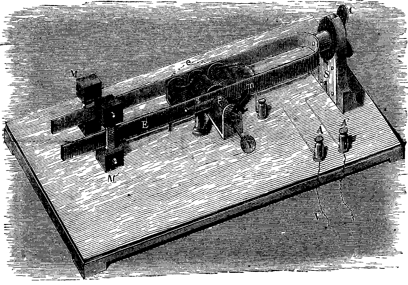 The hand-lever, k, rod, l, and bent lever, m, serve to bring about a motion in the opposite direction, and which disengages the drum, g, from the disk, e, and lets the hammer fall; the drum being then able to turn freely. If the lever, k, be afterward raised again, the spring, i, will act anew and couple the drum with the driving-shaft, so that the hammer will be lifted. In this rotary motion the screw, f, turns or re-enters into its nut, which it displaces toward the left, since it cannot itself move in that direction until the rectilinear motion be wiped out, and the power of the spring be thus overcome. At the same moment, the screw should naturally also make this rectilinear movement forward, that is to say, the coupling would be disengaged, if, at the least lateral motion toward the right, the spring, i, did not push the system toward the left. There is thus produced a state of equilibrium such that there is just enough friction between the disk, e, and the drum, g, to keep the hammer at rest and suspended. Through the action of an external force which lowers the lever, K, the hammer at once falls, and the screw issues anew from its nut and brings the parts into their former positions.