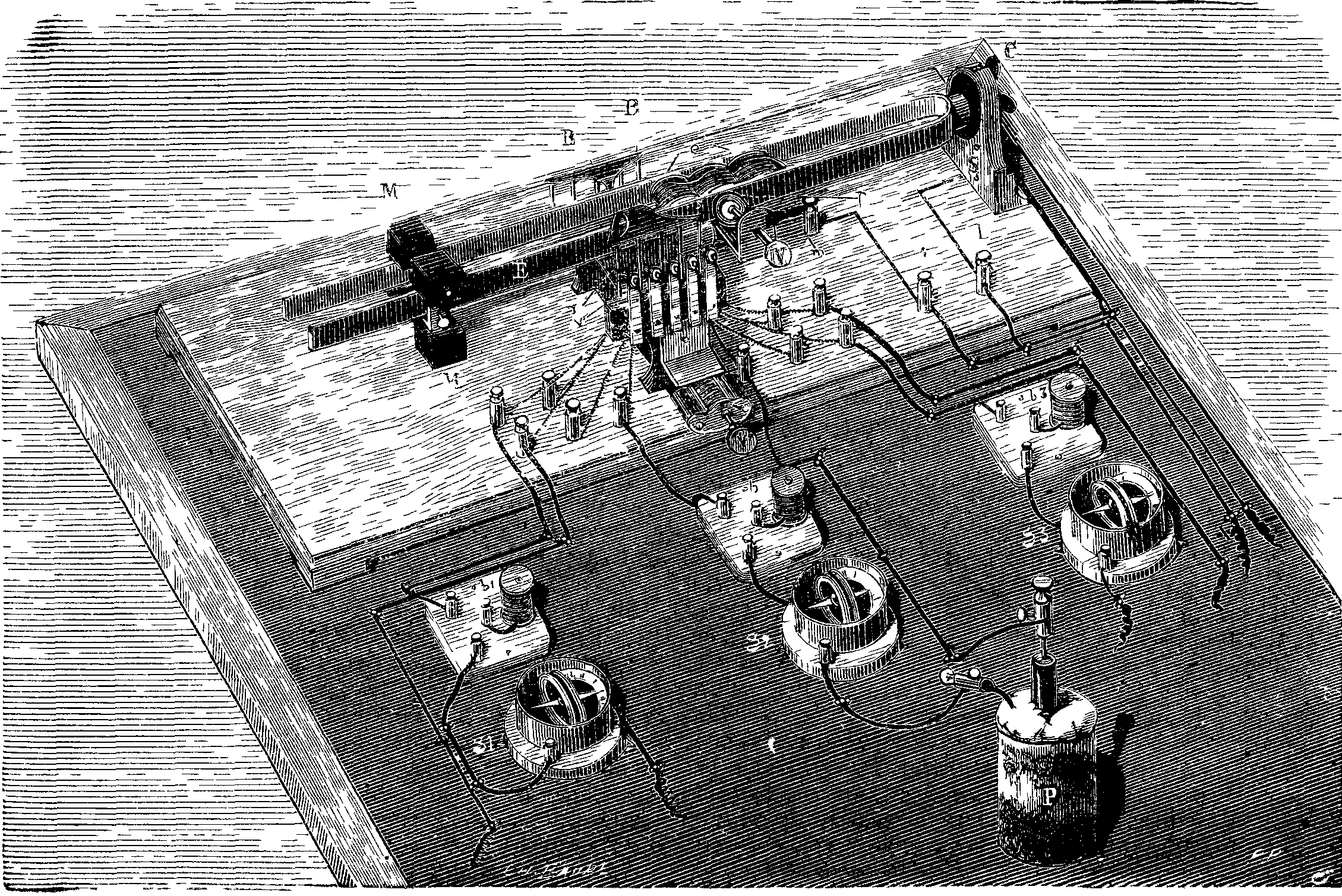 Each of the generators communicates by special pipes, a, with a single safety vessel, V, that operates the same as in the preceding apparatus. The agitator, Q, is of bronze, and is curved as shown in Fig. 11.