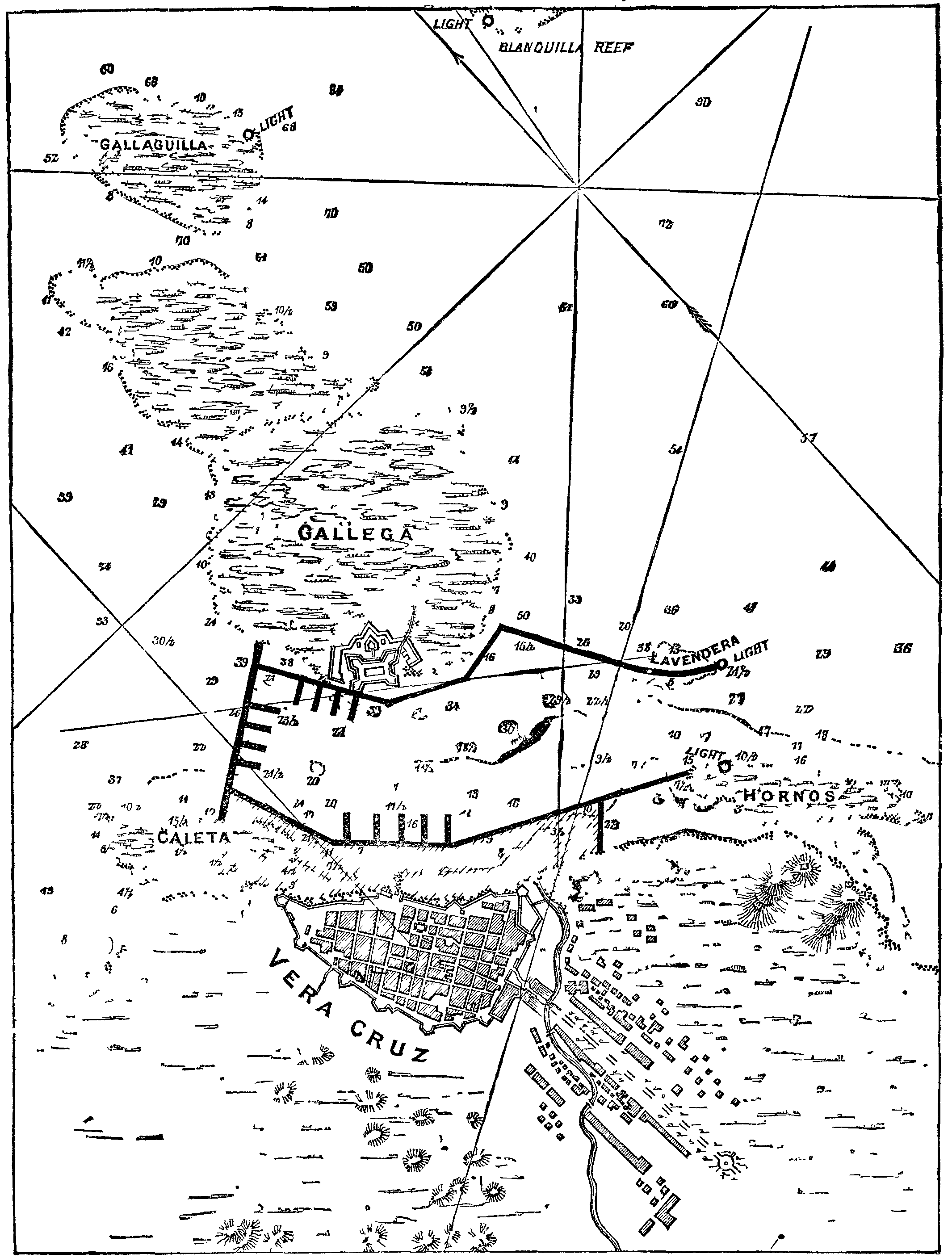 7. The erection of a lighthouse, at or near the eastern end of the Lavendera sea wall of a second on the eastern side of La Gallaguilla reef, and of another on the west side of La Blanquilla reef. These houses will be furnished with distinctive signals to enable steamers running in before another to run with safety between La Gallaguilla and La Blanquilla as soon as the Lavendera light is seen between the other two.