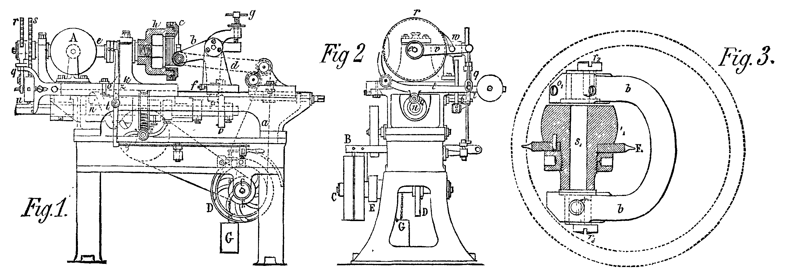 The construction of the tool carrier is represented in detail in Fig. 3. The cutting tool, F, rests on a sleeve forming part of the pulley, r1, against which it is pressed by a nut, while its position is fixed by a key. The axle, s1, of the tool is held in two boxes, in which it is fixed by screws. In order that the tool may be placed exactly in the axis of the wheel to be toothed, and that also the play produced by lateral wear of the pulley, r1, may be compensated for, two screws, r2, are arranged on the sides. All rotation of the shaft, s1, is prevented by a screw, o, which traverses the cast iron stirrup, C, and the steel axle box.