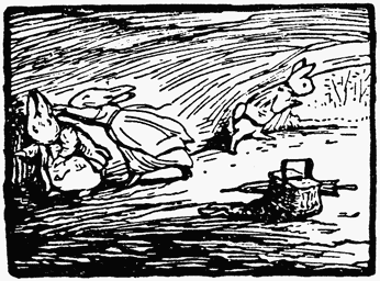 Benjamin Bunny sat up, staring; his whiskers twitched. Inside the stick house somebody dropped a plate, and said something. Benjamin stamped his foot, and bolted.[Pg 21]