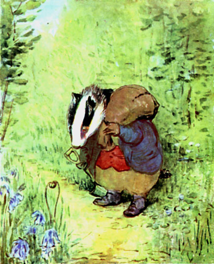 He never stopped till he came to the other side of the wood. Apparently Tommy Brock had turned the same way. Upon the top of the wall, there were again the marks of badger; and some ravellings of a sack had caught on a briar.