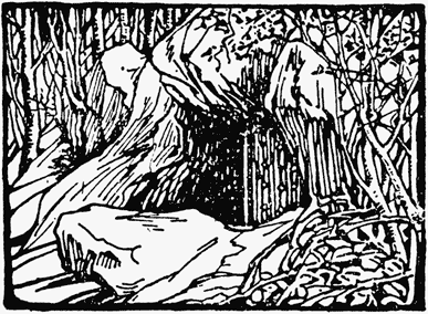 The sun had set; an owl began to hoot in the wood. There were many unpleasant things lying about, that had much better have been buried; rabbit bones and skulls, and chickens' legs and other horrors. It was a shocking place, and very dark.