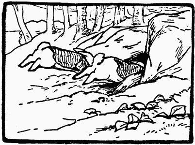 When they came near the wood at the top of Bull Banks, they went cautiously. The trees grew amongst heaped up rocks; and there, beneath a crag—Mr. Tod had made one of his homes. It was at the top of a steep bank; the rocks and bushes overhung it. The rabbits crept up carefully, listening and peeping.[Pg 30]