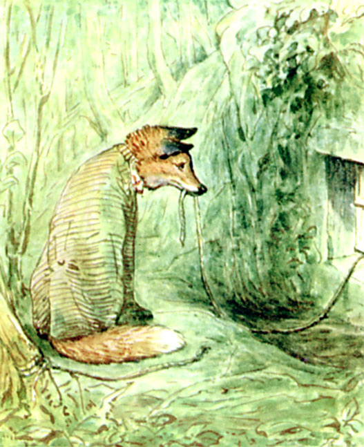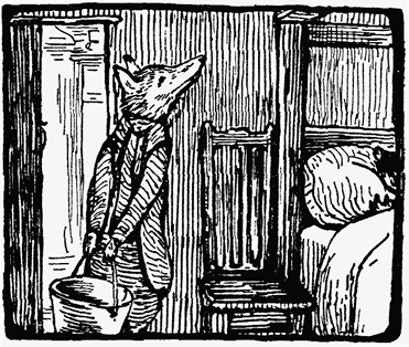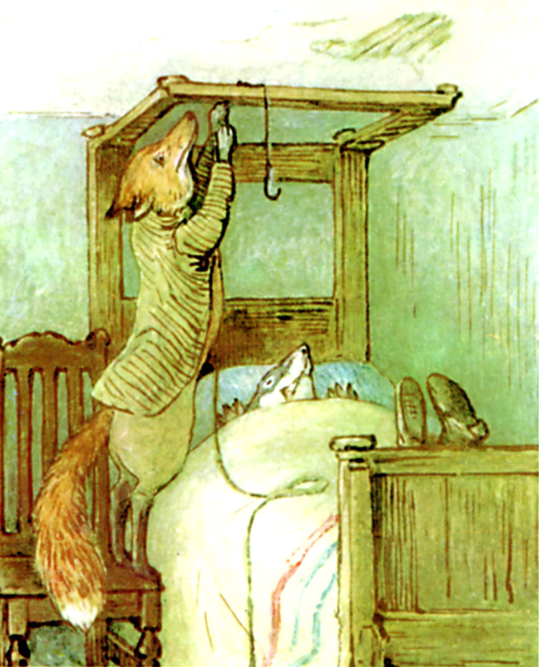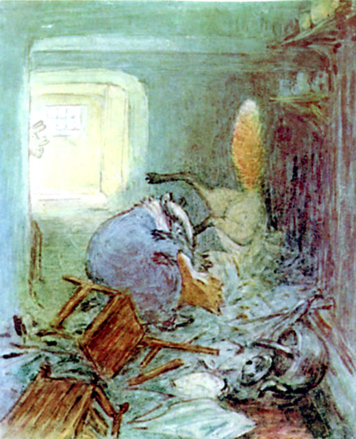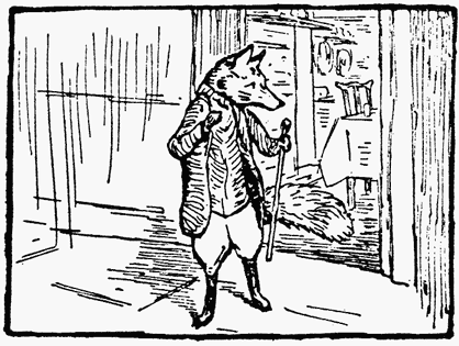 For the next twenty minutes Mr. Tod kept creeping cautiously into the house, and retreating hurriedly out again. By degrees he ventured further in—right into the bedroom. When he was outside the house, he scratched up the earth with fury. But when he was inside—he did not like the look of Tommy Brock's teeth.