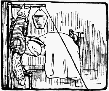 The room inside was so dark, that at first they could make out nothing; but they could hear a noise—a slow deep regular snoring grunt. And as their eyes became accustomed to the darkness, they perceived that somebody was asleep on Mr. Tod's bed, curled up under the blanket.—"He has gone to bed in his boots," whispered Peter.[Pg 37][Pg 36]