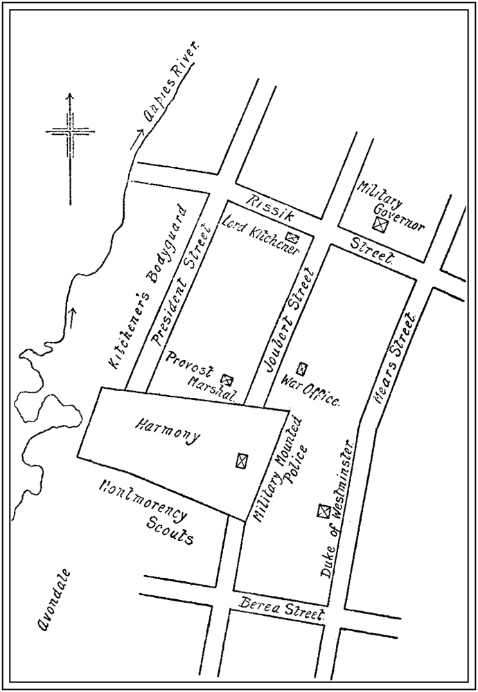 Looking south-east from Harmony, Mrs. and Miss van Warmelo were able to watch the Boer commandos pouring into the town—straggling would be a better word, for there was no one in command, and the weary men on their jaded horses passed in groups of twos and threes, and in small contingents of from fifty to a hundred.
