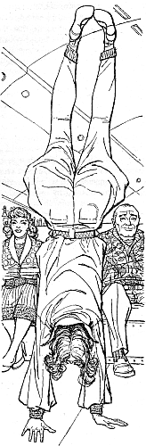 Jackknifing double, she put both forearms flat on the carpet and lifted both legs into the vertical. Then, silver slippers pointing motionlessly ceilingward, she got up onto her hands and walked twice around a vacant chair. She then performed a series of flips that would have done credit to a professional acrobat; the finale of which left her sitting calmly in the previously empty seat.