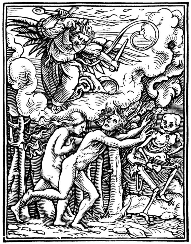 Adam and Eve, preceded by Death, playing on a beggar's lyre or hurdy-gurdy, are driven by the angel from Eden. | |