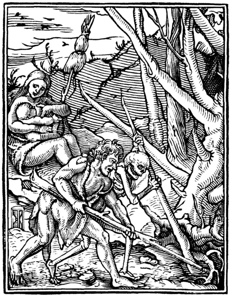 Adam, aided by Death, tills the earth. Eve, with a distaff, suckles Cain in the background. | |