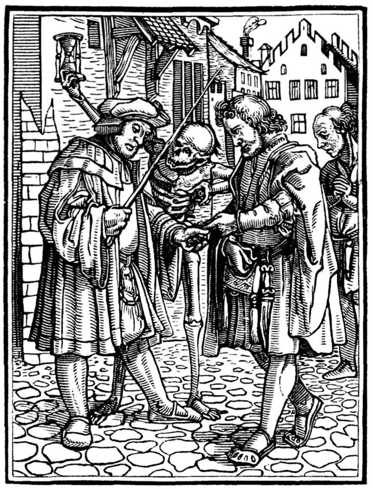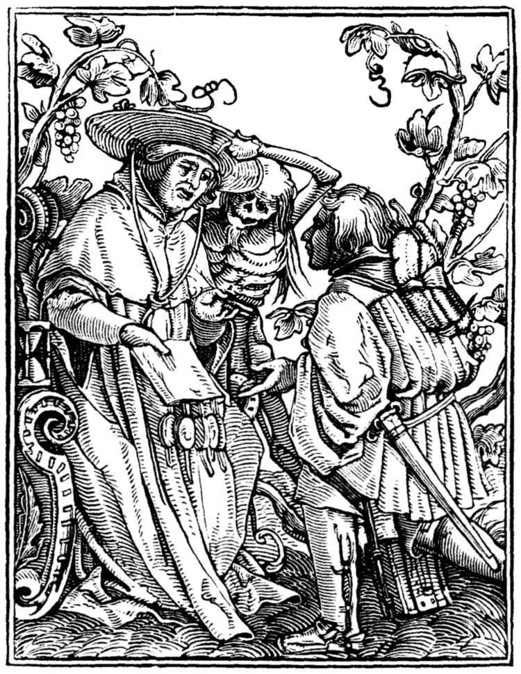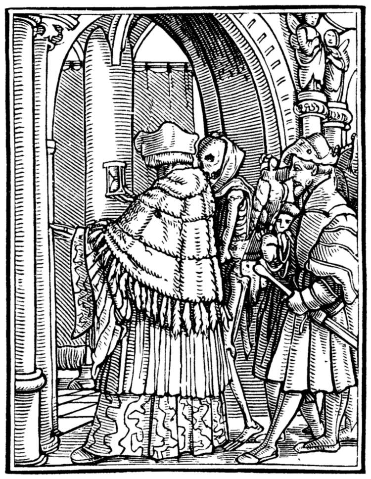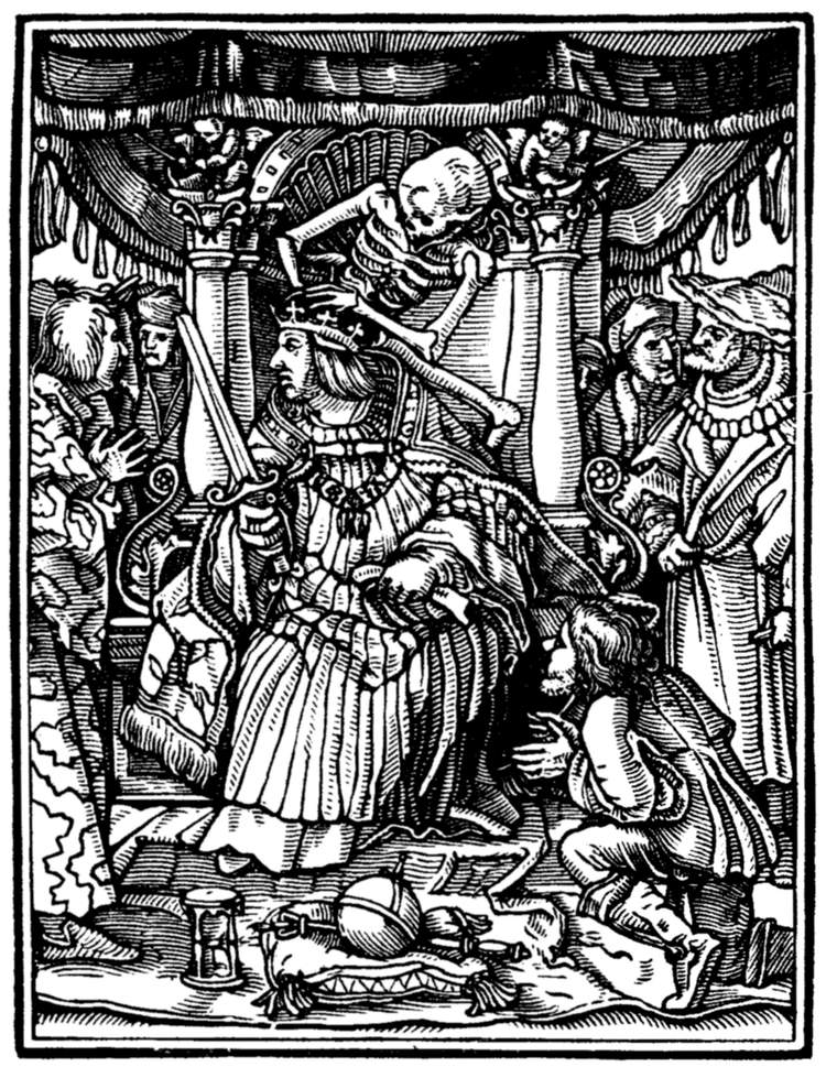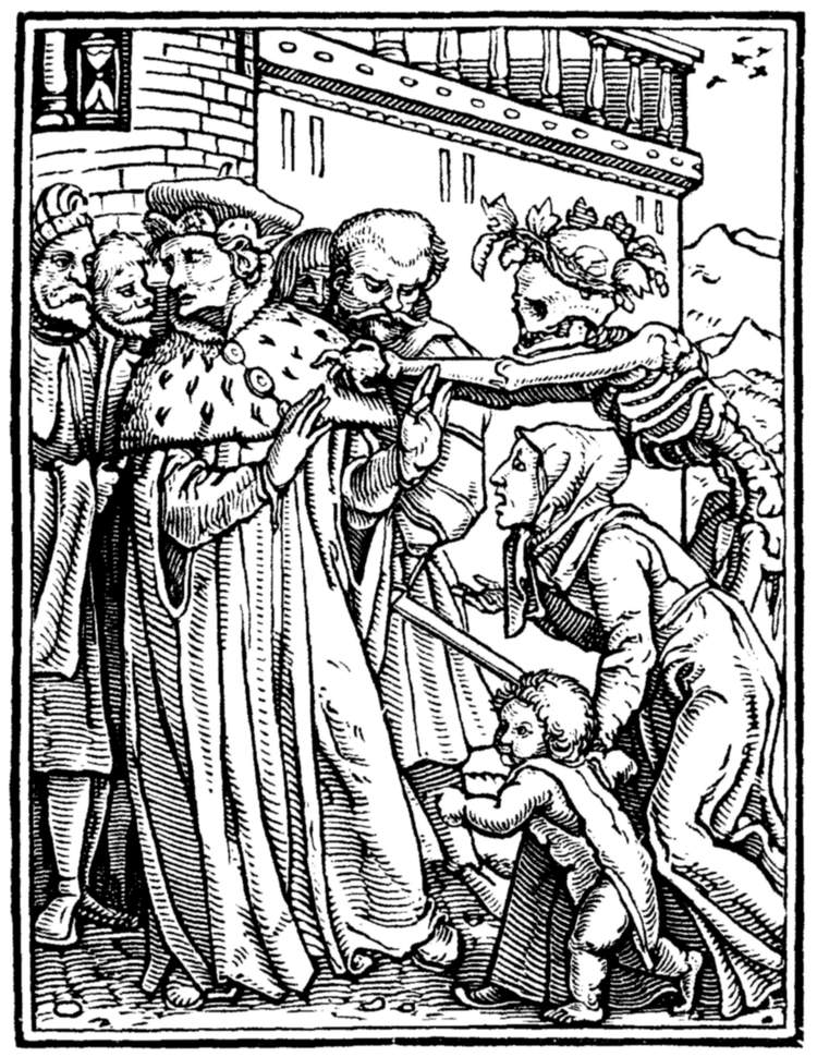 The Emperor (Maximilian I.) rates his minister for injustice to a suitor. But even in the act Death discrowns him. | |