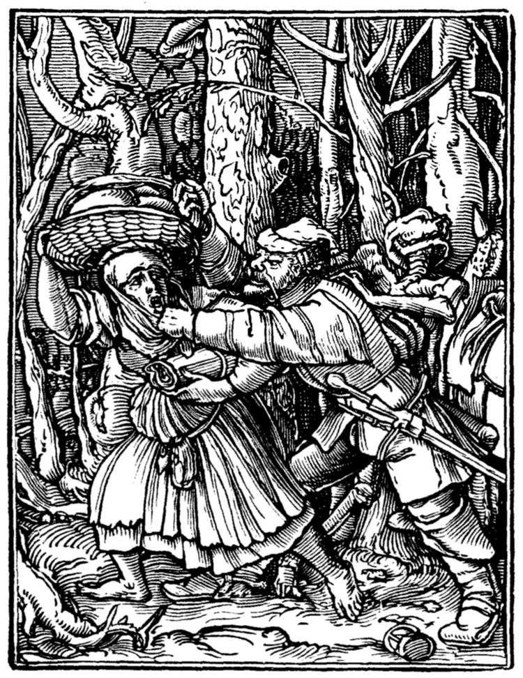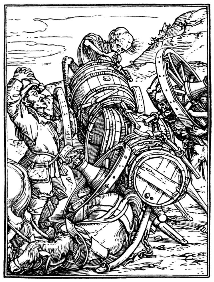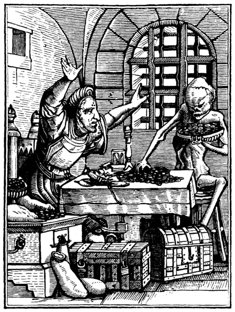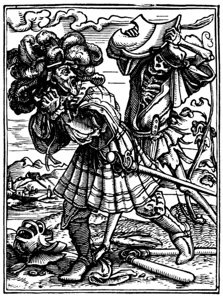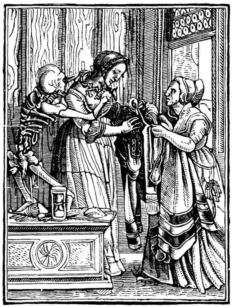 The Emperor (Maximilian I.) rates his minister for injustice to a suitor. But even in the act Death discrowns him. | |