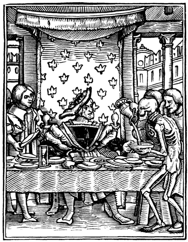 The King (Francis I.) sits at feast under a baldachin sprinkled with fleurs-de-lis. Death, as a cup-bearer, pours his last draught. | |