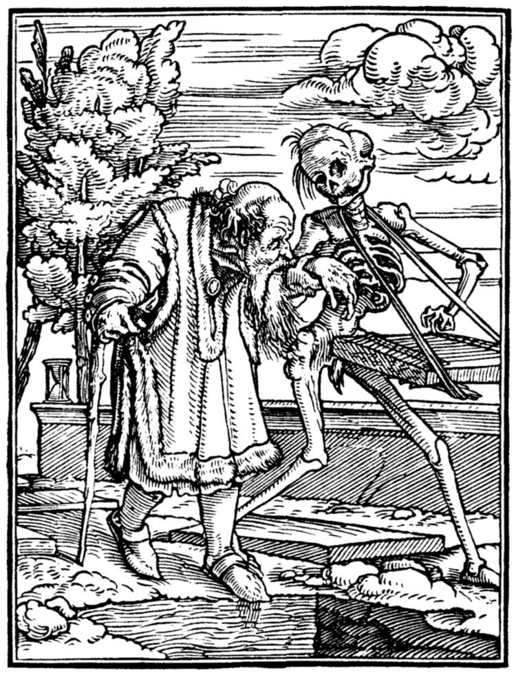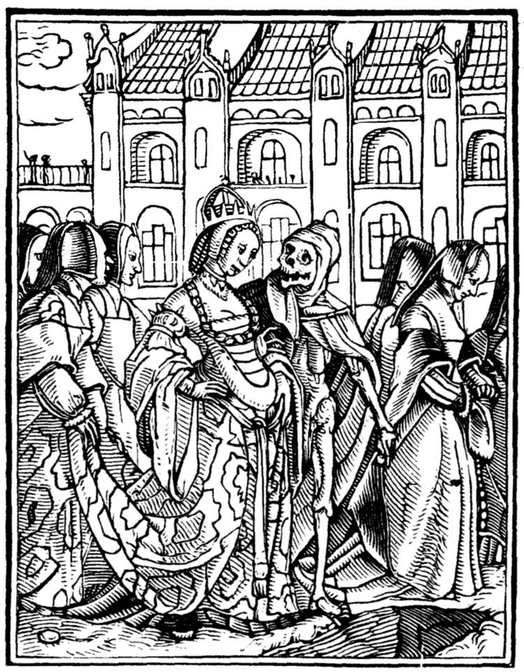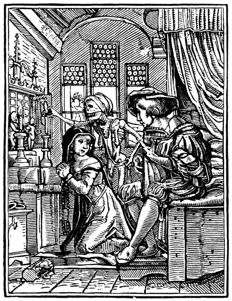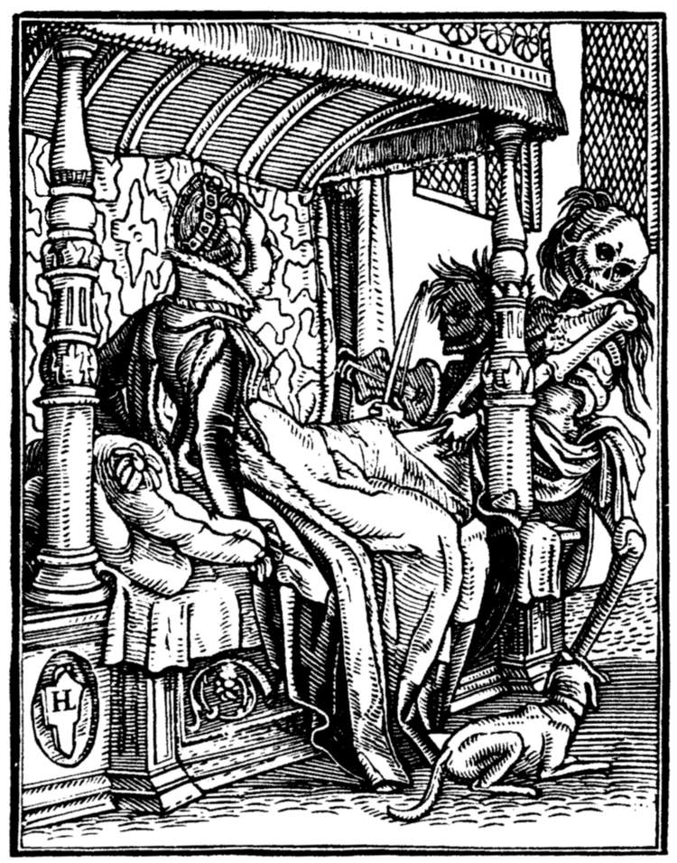 From the date of the editio princeps it might be supposed that the designs were executed at or about 1538—the year of its publication. But this is not the case; and there is good evidence that they were not only designed but actually cut on the wood some eleven years before [10] the book itself was published. There are, in fact, several sets of impressions in the British Museum, the Berlin Museum, the Basle Museum, the Imperial Library at Paris, and the Grand Ducal Cabinet at Carlsruhe, all of which correspond with each other, and are believed to be engraver's proofs from the original blocks. These, which include every cut in the edition of 1538, except "The Astrologer," would prove little of themselves as to the date of execution. But, luckily, there exists in the Cabinet at Berlin a set of coarse enlarged drawings in Indian ink, on brownish paper, of twenty-three of the series. These are in circular form; and were [11] apparently intended as sketches for glass painting. That they are copied from the woodcuts is demonstrable, first, because they are not reversed as they would have been if they were the originals; and, secondly, because one of them, No. 36 ("The Duchess"), repeats the conjoined "H.L." on the bed, which initials are held to be the monogram of the woodcutter, and not to be part of the original design. The Berlin drawings must therefore have been executed subsequently to the woodcuts; and as one of them, that representing the Emperor, is dated "1527," we get a date before which both the woodcuts, and the designs for the woodcuts, [12] must have been prepared. It is generally held that they were so prepared circa 1524 and 1525, the date of the Peasants' War, of the state of feeling excited by which they exhibit evident traces. In the Preface to this first edition, certain ambiguous expressions, to which we shall presently refer, led some of the earlier writers on the subject to doubt as to the designer of the series. But the later researches of Wornum and Woltmann, of M. Paul Mantz and, more recently, of Mr. W. J. Linton leave no doubt that they were really drawn by the artist to whom they have always been traditionally assigned, to wit, Hans Holbein the younger. He [13] was resident in Basle up to the autumn of 1526, before which time, according to the above argument, the drawings must have been produced; he had already designed an Alphabet of Death; and, moreover, on the walls of the cemetery of the Dominican monastery at Basle there was a famous wall-painting of the Dance of Death, which would be a perpetual stimulus to any resident artist. Finally, and this is perhaps the most important consideration of all, the designs are in Holbein's manner.
