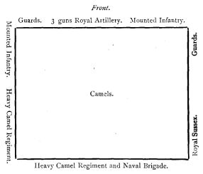 As the British army advanced—the baggage, cast into a circle, was left close in the rear, surrounded by camels, which were made to lie down with their heads inwards, and their bales placed within them for their armed followers to fire over, thus forming a fortress not very easy to storm. Two hundred and fifty Poona horsemen, and four companies of infantry under Captain Tait, were the only force which could be spared for its protection.
