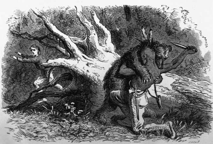 The inmates, men, women and children, seated upon these cushions, presented a very attractive and cheerful aspect. Several hundred of these wigwams were frequently clustered upon some soft meadow by the side of a flowing stream, fringed with a gigantic forest, and exhibited a spectacle of picturesque loveliness quite charming to the beholder. The furniture of these humble abodes was extremely simple. They had no pots or kettles which would stand the fire. They had no knives nor forks; no tables nor chairs. Sharp flints, such as they could find served for knives, with which, with incredible labor, they sawed down small trees and fashioned their bows and arrows. They had no roads except foot paths through the wilderness, which for generations their ancestors had traversed, called "trails." They had no beasts of burden, no cows, no flocks nor herds of any kind. They generally had not even salt, but cured their meat by drying it in the sun. They had no ploughs, hoes, spades, consequently they could only cultivate the lightest soil. With a sharp stick, women loosened the earth, and then depositing their corn or maize, cultivated it in the rudest manner.