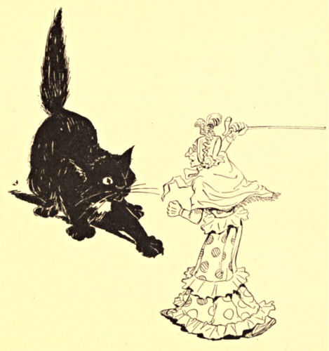 “Oh, I’m here,” exclaimed another tinkling voice from the fireplace, “but I’m not coming in. They are not asleep, and, even if they were, I see the big Black Cat in that chair there.”