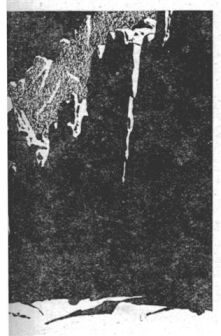 After the sun rose, Evans returned to the lava cave that he had been exploring when the meteor hit. Inside, he lifted his filter visor, and found that the light reflected from the small ray that peered into the cave door lighted the cave adequately. He tapped loose some white crystals on the cave wall with his geologist's hammer, and put them into a collector's bag.