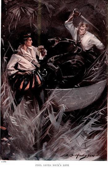 Not much was said as the strangely assorted pair strode along side by side on their way to the water, for both of them loved boats, and sailing, and all that pertained to the sea life, and both were equally eager to get afloat as quickly as possible, so as not to waste unnecessarily a moment of that glorious evening. At last, however, as Dick turned unexpectedly into a narrow side alley, Stukely pulled up short with:
