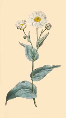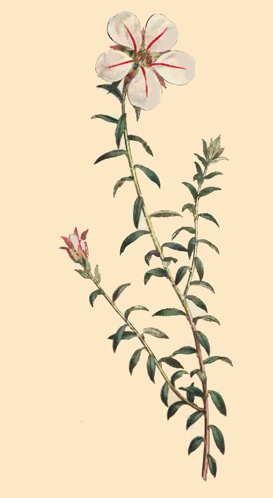NECTARY situated below the Petals, perfectly white, somewhat ovate, the sides folding together, before the flower fully expands, nearly upright, embracing and containing within it the Pistillum and Stamen, on touching it ever so slightly with the point of a pin, while in this state, it suddenly springs back and quits the Pistillum, the lower elastic part of it is then bent in the form represented in a magnified view of the flower on the plate, fig. 4. this curious phœnomenon has not been noticed by Cavanille.