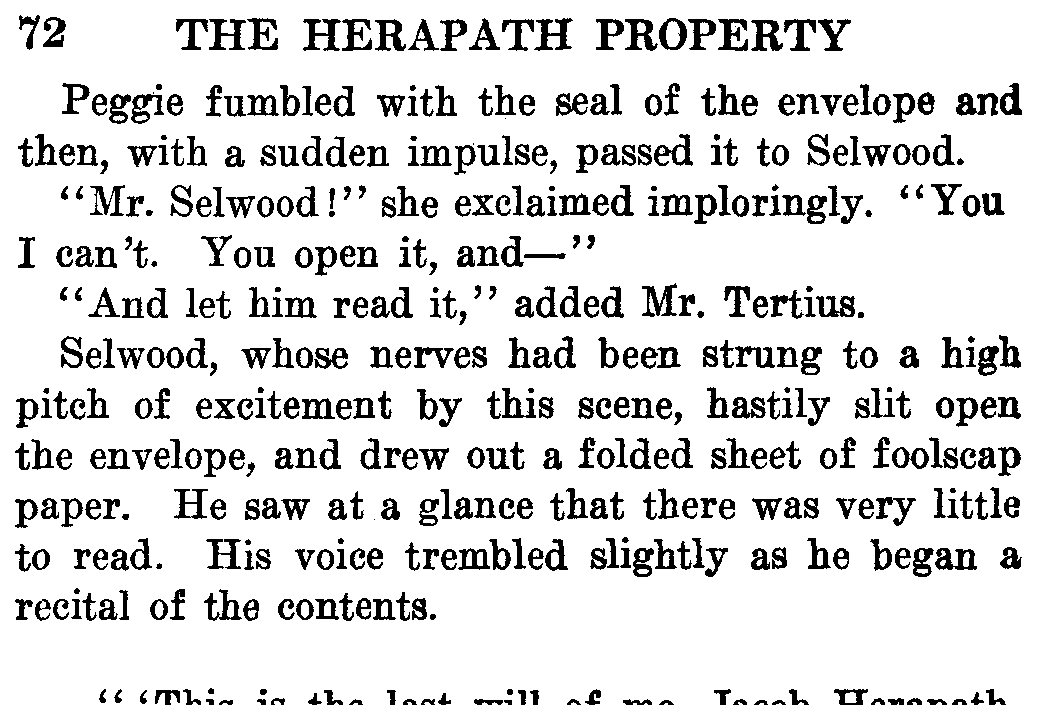 Jacob Herapath, a speculator in real estate, had always cherished a notion of building a mass of high-class residential flats on the most modern lines. Nothing of the sort which he contemplated, he said, existed in London—when the opportunity came he would show the building world what could and should be done. The opportunity came when a parcel of land in Kensington fell into the market—Jacob Herapath made haste to purchase it, and he immediately began building on it. The result was a magnificent mass of buildings which possessed every advantage and convenience—to live in a Herapath flat was to live in luxury. Incidentally, no one could live in one who was not prepared to pay a rental of anything from five to fifteen hundred a year. The gross rental of the Herapath Flats was enormous—the net profits were enough to make even a wealthy man’s mouth water. And Selwood, who already knew all this, wondered, as they drove away, where all this wealth would go if anything had really happened to its creator.
