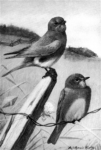 There never was a happier or more devoted husband than the male bluebird. He is the gay champion and escort of the female at all times, and while she is sitting he feeds her regularly. It is very pretty to watch them building their nest. The male is very active in hunting out a place and exploring the boxes and cavities, but seems to have no choice in the matter and is anxious only to please and encourage his mate, who has the practical turn and knows what will do and what will not. After she has suited herself he applauds her immensely, and away the two go in quest of material for the nest, the male acting as guard and flying above and in advance[2] of the female. She brings all the material and does all the work of building, he looking on and encouraging her with gesture and song. He acts also as inspector of her work, but I fear is a very partial one. She enters the nest with her bit of dry grass or straw, and, having adjusted it to her notion, withdraws and waits near by while he goes in and looks it over. On coming out he exclaims very plainly, "Excellent! excellent!" and away the two go again for more material.