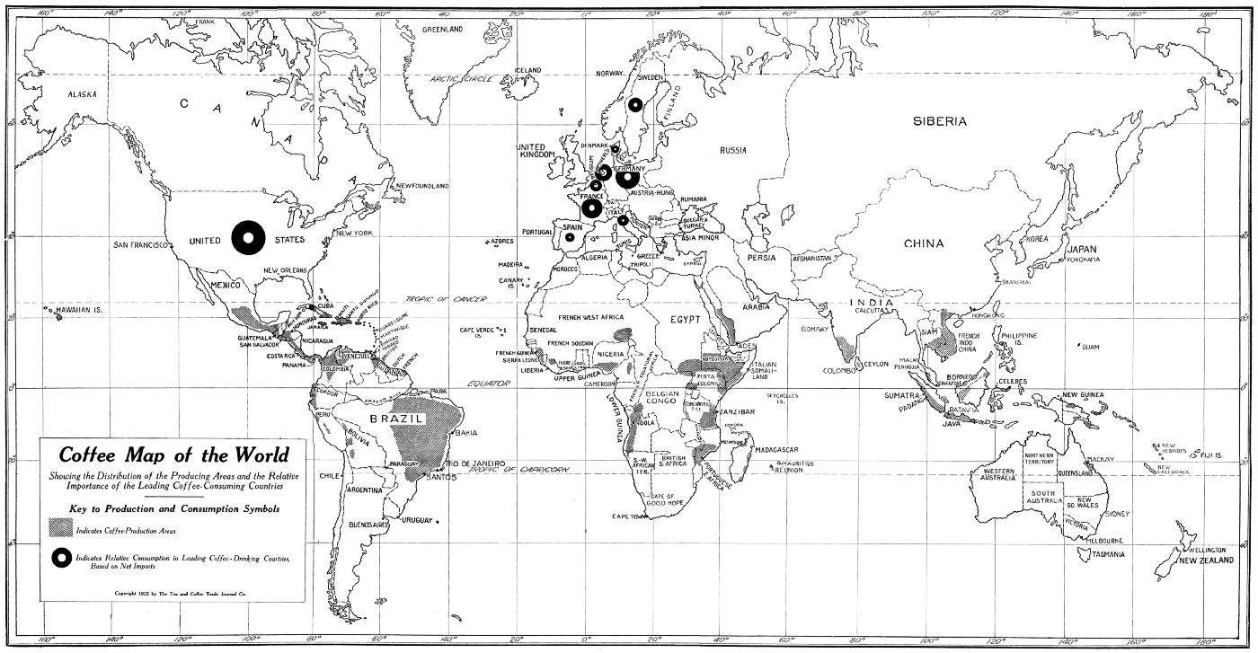 The year 1919 awarded coffee one of its brightest honors. An American general said that coffee shared with bread and bacon the distinction of being one of the three nutritive essentials that helped win the World War for the Allies. So this symbol of human brotherhood has played a not inconspicuous part in "making the world safe for democracy." The new age, ushered in by the Peace of Versailles and the Washington Conference, has for its hand-maidens temperance and self-control. It is to be a world democracy of right-living and clear thinking; and among its most precious adjuncts are coffee, tea, and cocoa—because these beverages must always be associated with rational living, with greater comfort, and with better cheer.
