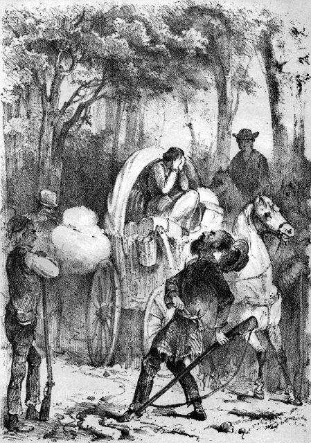 Der Mann (und der Indiana-Farmer hatte ganz recht, es war jedenfalls ein Jude seinem ganzen Aussehn und Wesen nach), ging jetzt daran den Tisch, der mitten in der Hütte stand, für seinen Gast herzurichten; von einem an der Wand befestigten Bret nahm er ein kleines altes Stück Wachstuch, das er mit dem Ellbogen von alten Fettflecken oder Staub reinigte, breitete es dann auf den Tisch, legte einen halben Laib Waizenbrod daneben, nahm ein Messer aus der Schieblade, das er in das Brod hineinstieß, und ging dann zu einem kleinen Eckschrank, aus dem er eine grüne bauchige Flasche und und ein großes Glas herausholte. Hierauf füllte er einen kleinen eisernen Kessel mit Wasser, stellte ihn auf die Kohlen, und verließ auf kurze Zeit das Haus.