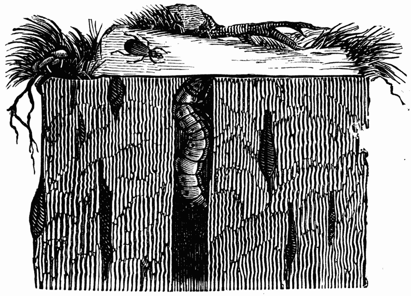 The larva of the Tiger Beetle (Cicindela campestris) constructs a hole about the size of a feather quill, disposed vertically, and of a depth, enormous for its size, of forty centimetres. It maintains itself in this tube by arching its supple body along the walls at a height sufficient for the top of its head to be level with the surface of the soil, and to close the opening of the hole. (Fig. 1.) A little insect — an ant, a young beetle, or something similar — passes. As soon as it begins to walk on the head of the larva, the latter letting go its hold of the wall allows itself to fall to the bottom of the trap, dragging its victim with it. In this narrow prison it is easily able to obtain the mastery over its prey, and to suck out the liquid parts.12