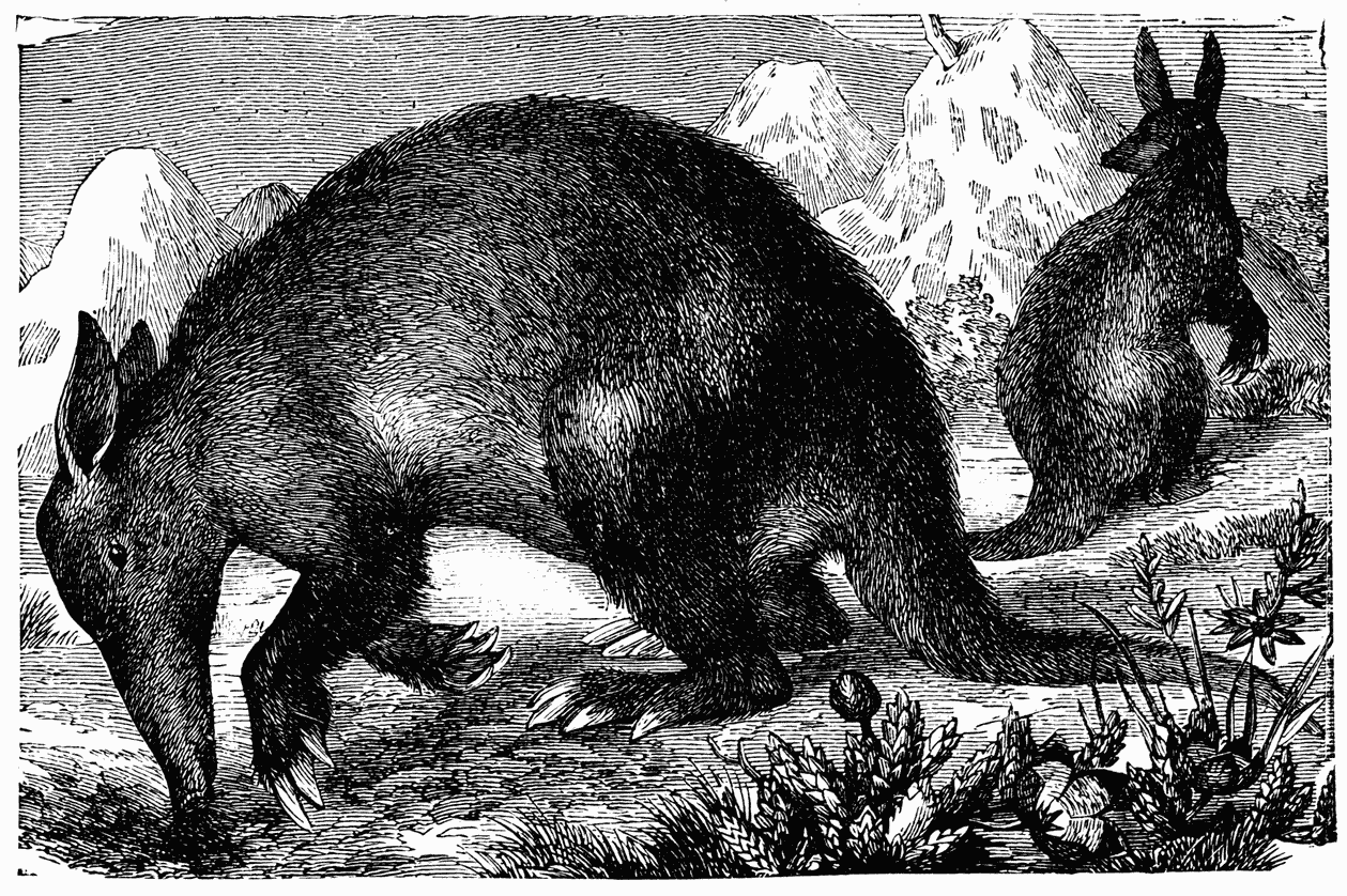 The animals who feed on species living in societies either seize on their prey when isolated or when all the members of the colony are united in their city. A search for the nest is necessary in the case of creatures who are very small in comparison with the hunter, as in the case of ants and the Ant-eater. But the ant-eater possesses a very long and sticky tongue, which renders the capture of these insects extremely easy; when he finds a frequented passage it is enough to stretch out his tongue; all the ants come of their own accord and place themselves on it, and when it is sufficiently charged he withdraws it and devours them. The African Orycteropus (Fig. 2), who is also a great eater of ants and especially of termites, is equally aided by a very developed tongue; but he has less patience than the ant-eater, and he adds to this resource other proceedings which render the hunt more fruitful and enable him to obtain a very large number of insects at one time. Thanks to his keenness of scent he soon discovers an ant-path bearing the special and characteristic odour which these Hymenoptera leave behind them, and he follows the track which leads to their nest. On arriving there, without troubling himself about the scattered insects that prowl in the neighbourhood, he sets himself to penetrate into the midst of the dwelling, and with his strong claws hollows out a passage which enables him to gain access. On the way he pierces walls, breaks down floors, gathering here and there some fugitives, and arrives at last at the centre, in which millions of animals swarm. He then swallows them in large mouthfuls and retires, leaving behind him a desert and a ruin in the spot before occupied by a veritable palace, full of prodigious activity.