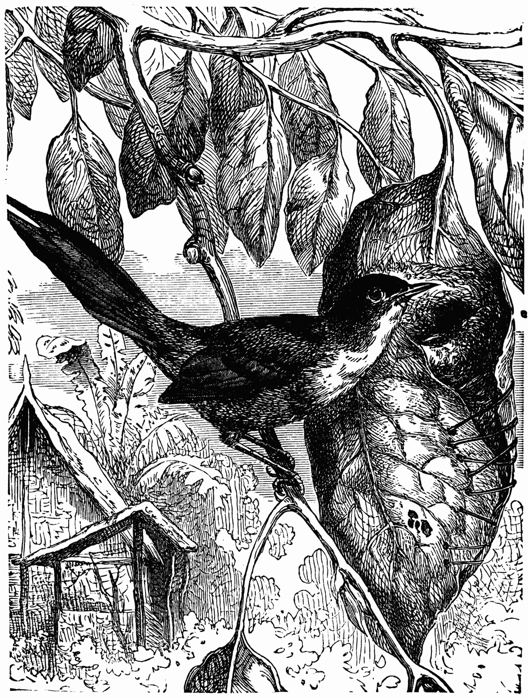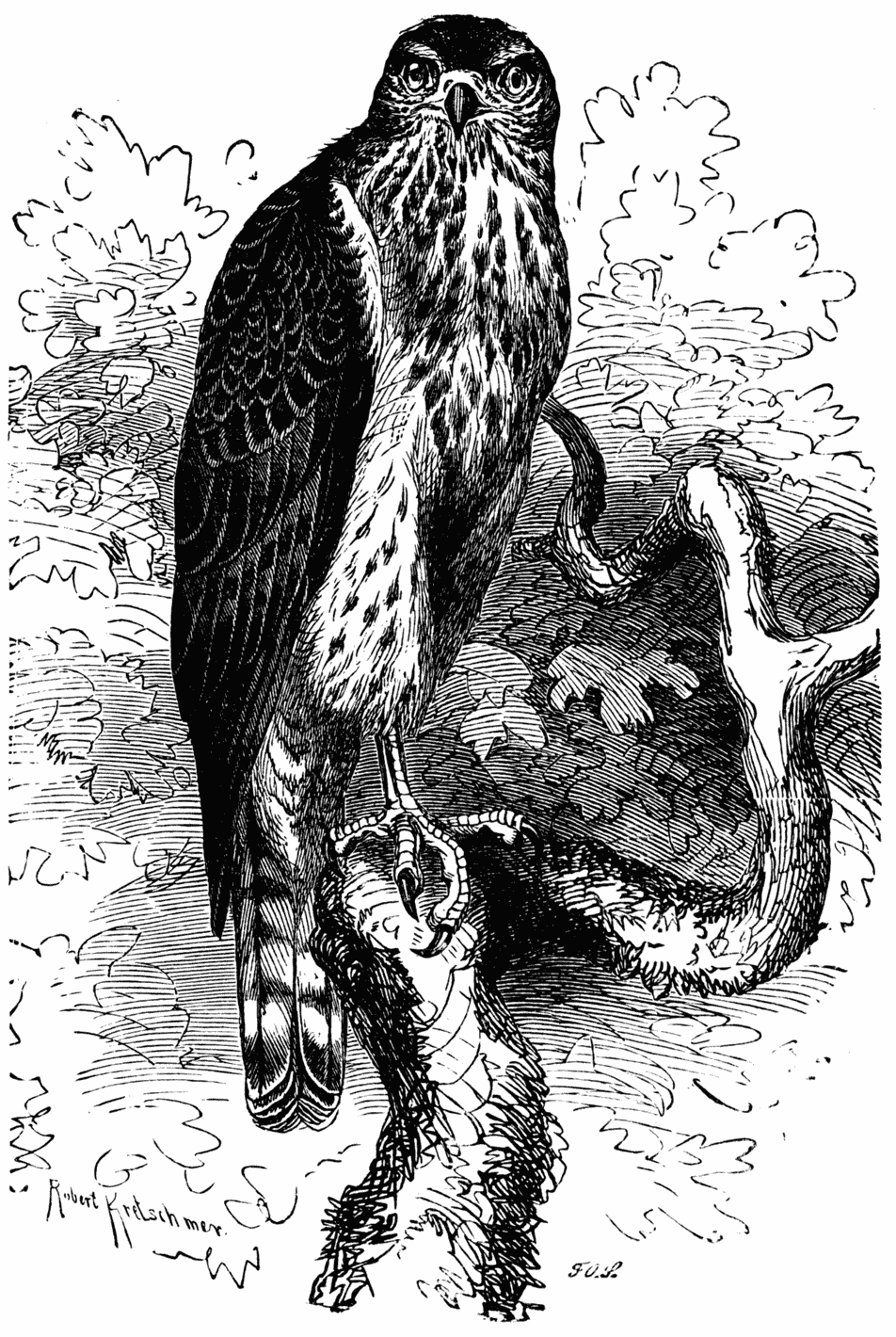 Birds of prey also invent ingenious combinations to reach a good flier. Most of the great rapacious birds of rapid flight or with powerful talons are so well organised for the chase that they have no need of cunning. To see the prey, to seize it and devour it, are acts accomplished in a moment by the single fact of their natural organisation. It is rather among those who are less well endowed that one finds real art and frequent ruses. The Goshawk (Astur palumbarius, Fig. 3) is sufficiently strong and flies sufficiently well to seize small birds; but in order to obtain a copious repast at one snatch he prefers to attack pigeons. Generally the strength of their wings promptly places them in safety. He therefore hides himself in the neighbourhood of the pigeon-house, ready to fall on those pigeons who pick up food around. But the pigeons are suspicious, and if they recognise his presence they remain hidden in their dwellings. In this case it has sometimes been found that the Goshawk has quietly flown up to their house and alighted on its summit; there, by violently beating his wings, he gives a succession of sudden blows to the roof. Startled and frightened by this unaccustomed noise, the inhabitants dart out, and the bird of prey can then profit by their alarm to seize one or two.19