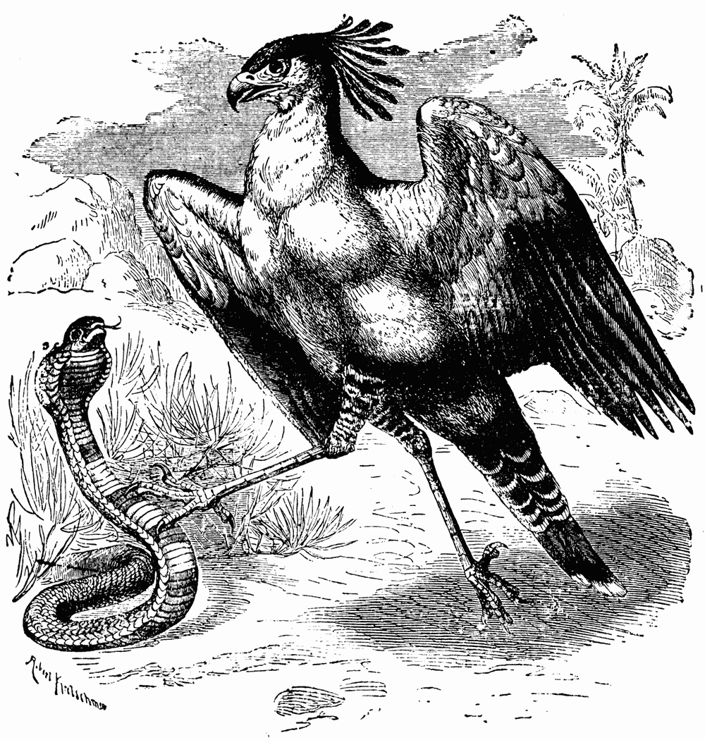 The bird who displays the most remarkable qualities in this struggle which terminates the chase, exhibiting indeed a real fencing match, is the Secretary Bird (Gypogeranus reptilivorus. Fig. 4.) He is the more interested in striking without being himself struck since the fangs with which his prey, the snake, is generally armed might at the first blow give him a mortal wound. In South Africa he pursues every snake, even the most venomous. Warned by instinct of the terrible enemy he has met, the reptile at first seeks safety in flight; the Secretary follows him on foot, and the ardour of the chase does not prevent him from being constantly on guard. This is because the snake, finding himself nearly overtaken, suddenly turns round, ready to use his defensive weapons. The bird stops, and turns in one of his wings to protect the lower parts of his body. A real duel then begins. The snake throws himself on his enemy, who at each stroke parries with the end of his wing; the fangs are buried in the great feathers which terminate it, and there leave their poison without producing any effect. All this time with the other wing the Secretary repeatedly strikes the reptile, who is at last stunned, and rolls over on the earth. The conqueror rapidly thrusts his beak into his skull, throws his victim into the air, and swallows him.20