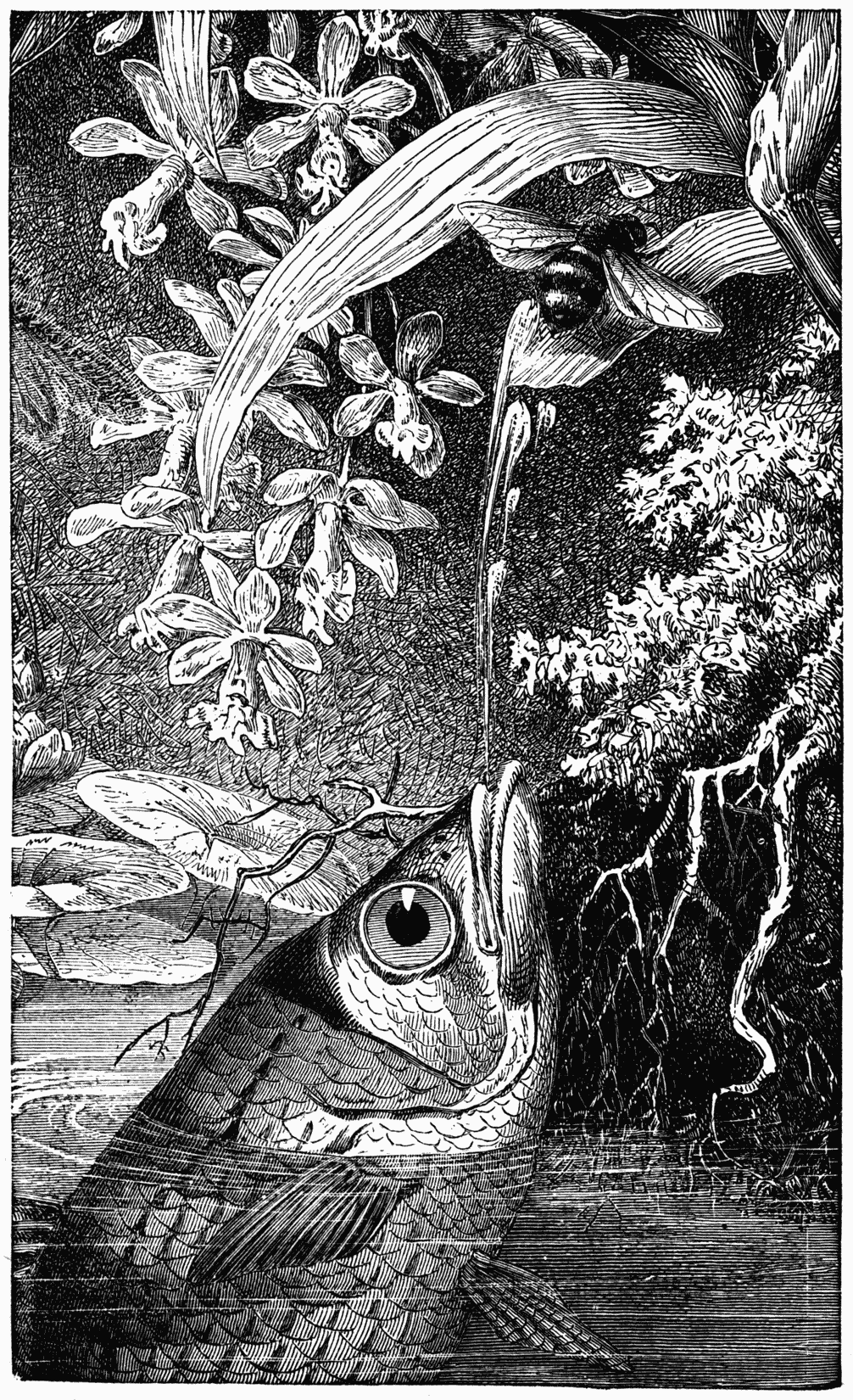 Another fish, the Chelinous of Java, also acts in this manner. He generally lives in estuaries. It is therefore a brackish water which he takes up and projects by closing his gills and contracting his mouth; he can thus strike a fly at a distance of several feet. Usually he aims sufficiently well to strike it at the first blow, but sometimes he fails. Then he begins again until he has succeeded, which shows that his movements are not those of a machine. He knows what he is doing, what effect ought to be produced, and whether this desired result has happened, and he perseveres until the insect has fallen. These facts are unquestioned; the Chinese preserve these curious fish in jars, and amuse themselves by making them carry on this little exercise. Many observers have witnessed and described it.