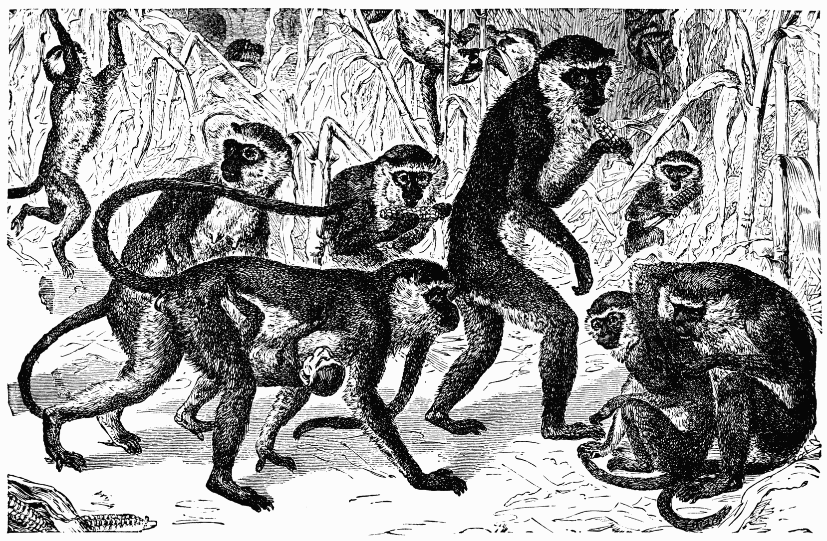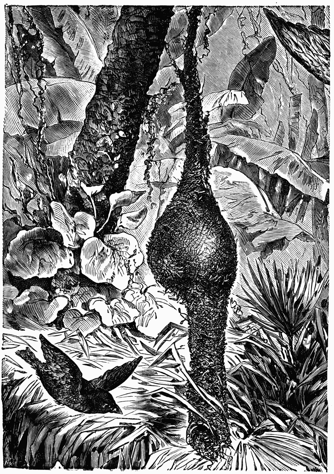 The Alligator of Florida and of Louisiana delights in this chase. He seeks in particular the Great Boat-Tail (Quiscalus major) which nests in the reeds at the edge of marshes and ponds. When the young have come out and are expecting from their parents the food which the chances of the hunt may delay, they do not cease chirping and calling by their cries. But the parents are not alone in hearing these appeals. They may also strike the ears of the alligator, who furtively approaches the imprudent singers. With a sudden stroke of his tail he strikes the reeds and throws into the water one or more of the hungry young ones, who are then at his mercy. (Audubon.)