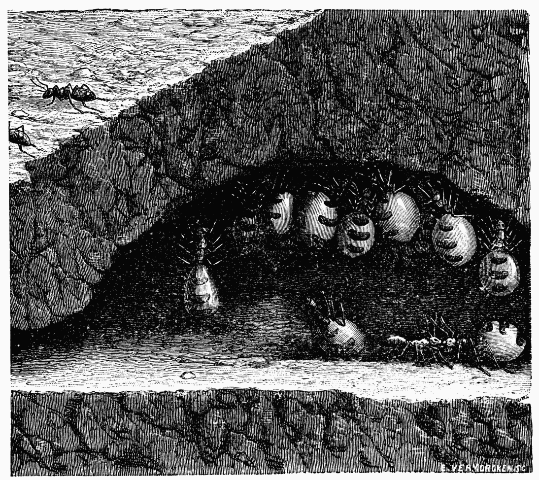 Provisions laid up for a short period — Provisions laid up for a long period — Animals who construct barns — Physiological reserves — Stages between physiological reserves and provisions — Animals who submit food to special treatment in order to facilitate transport — Care bestowed on harvested provisions — Agricultural ants — Gardening ants — Domestic animals of ants — Degrees of civilisation in the same species of ants — Aphis-pens and paddocks — Slavery among ants.