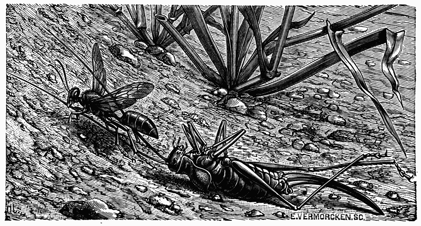 An interesting member of the Hymenoptera, the Sphex, assures food for the early days of the life of its larvæ in a curious way.7 Before laying its eggs it seizes a cricket, paralyses it with two strokes of its sting — one at the articulation of the head and the neck, the other at the articulation of the first ring of the thorax with the second — each stab traversing and poisoning a nervous ganglion. The cricket is paralysed without being killed; its flesh does not putrefy, and yet it makes no movement. The Sphex places an egg on this motionless prey, and the larva which emerges from it devours the cricket. Here assuredly is a marvellous and certain instinct. One cannot even object that the strokes of the sting are inevitably directed to these points because the chitinous envelope of the victim offers too much resistance in other spots for the dart to penetrate, because here is the Ammophila, a near relative of the Sphex, which chooses for its prey a caterpillar. It is free to introduce its sting into any part of the body, and yet with extreme certainty it strikes the two ganglions already mentioned.8