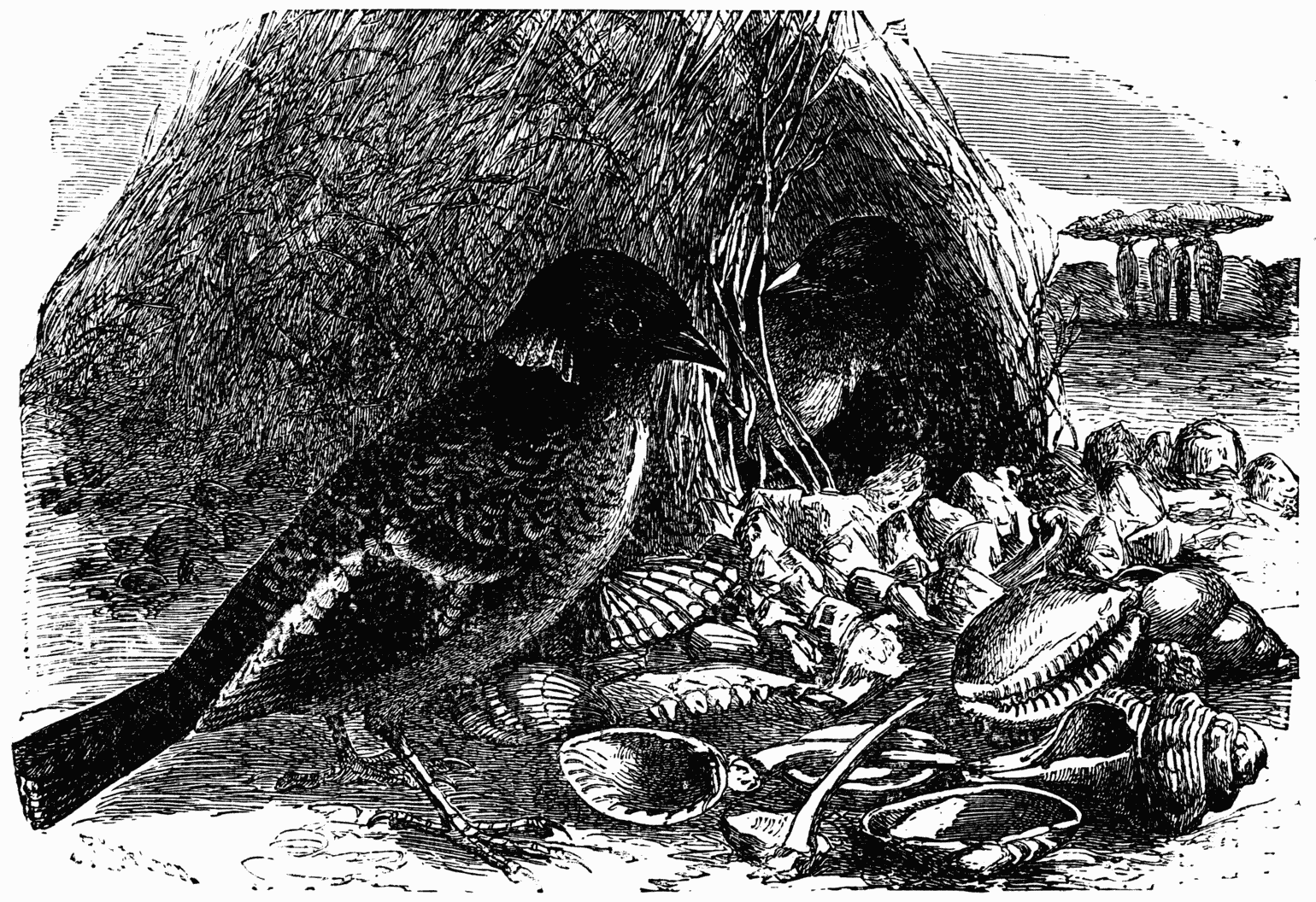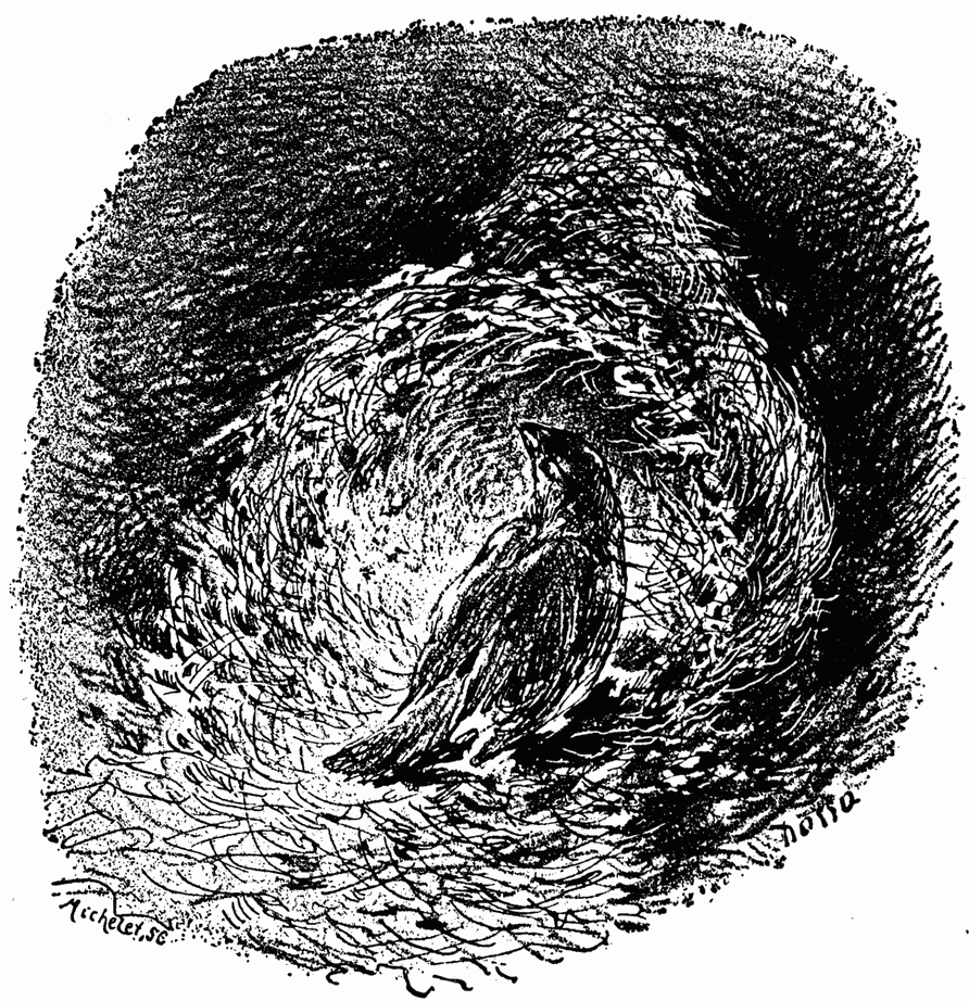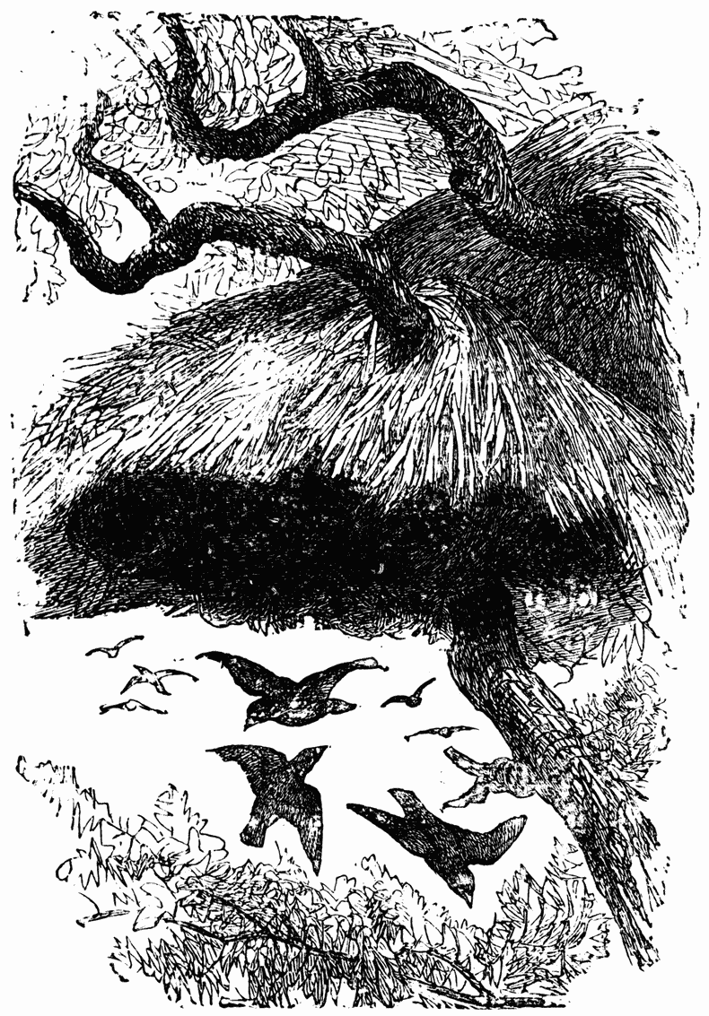 In the wild regions of Africa it happens that from some reason or another, perhaps from the effect of lightning on immense forests, dense thickets or plains covered by tall plants become the prey of gigantic fires which spread as long as they find food on their road. The heat as of a furnace arises above and around; an acrid smoke veils everything, and the frightened animals flee before the scourge. Travellers who have witnessed these magnificent scenes often insist on the panics thus produced, and describe the inoffensive lion fleeing in the midst of a herd of gazelles. All are seized by the same fear, because all are exposed to the same danger. But birds, whose wings can carry them at will afar from the furnace, preserve greater presence of mind, and profit by the public calamity and general anxiety to make a successful hunt and copious feasts. One may see the birds of prey flying in front of the fire and seizing easy victims. Certain birds of Africa are the most furious hunters during a fire. Legions of insects flee far from the tall dried plants, and clouds of birds arrive to throw themselves on them. They pursue them with incredible audacity through the smoke close to the flames and always retire in time to avoid singeing. A member of the Crow family who inhabits India, Anomalocorax splendens, enjoys a deserved reputation of astuteness and allows no opportunity to escape without seizing it by the forelock. In ordinary times his food is composed of very varied substances — crabs, insects, worms, etc.; but if he perceives afar an ascending cloud he immediately abandons his small researches, knowing there is something better to be done over there. He is not selfish, and he calls a few comrades and they all put themselves into position to await events. They know very well the relation that exists between this smoke and the prey they covet. The fire indicated by the smoke can have no other reason in this hot country than the cooking of food. A Hindoo family are in fact installed and preparing their repast. The birds see all this and observe. The Hindoos are accustomed to throw outside the remains of their meals, and the Anomalocorax, who have come together from afar to await patiently this result, then throw themselves on the quarry. (Jerdon.)