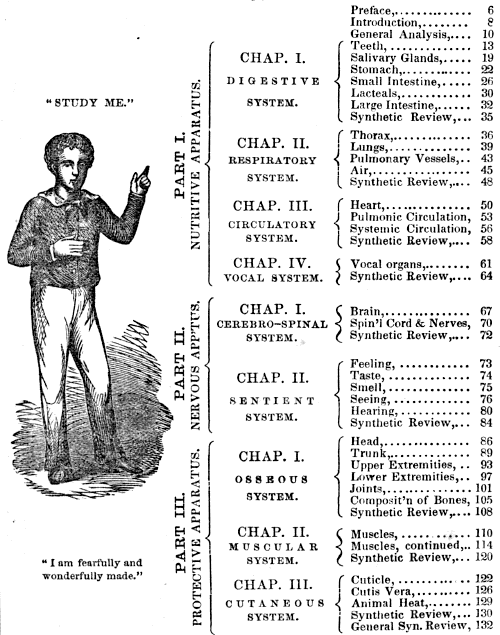 As the work is divided into chapters, the subjects of which are complete in themselves, the pupil may commence the study of the structure, use, and laws of the several parts of which the human system is composed, by selecting such chapters as fancy or utility may dictate, without reference to their present arrangement,—as well commence with the chapter on the digestive organs as on the bones.